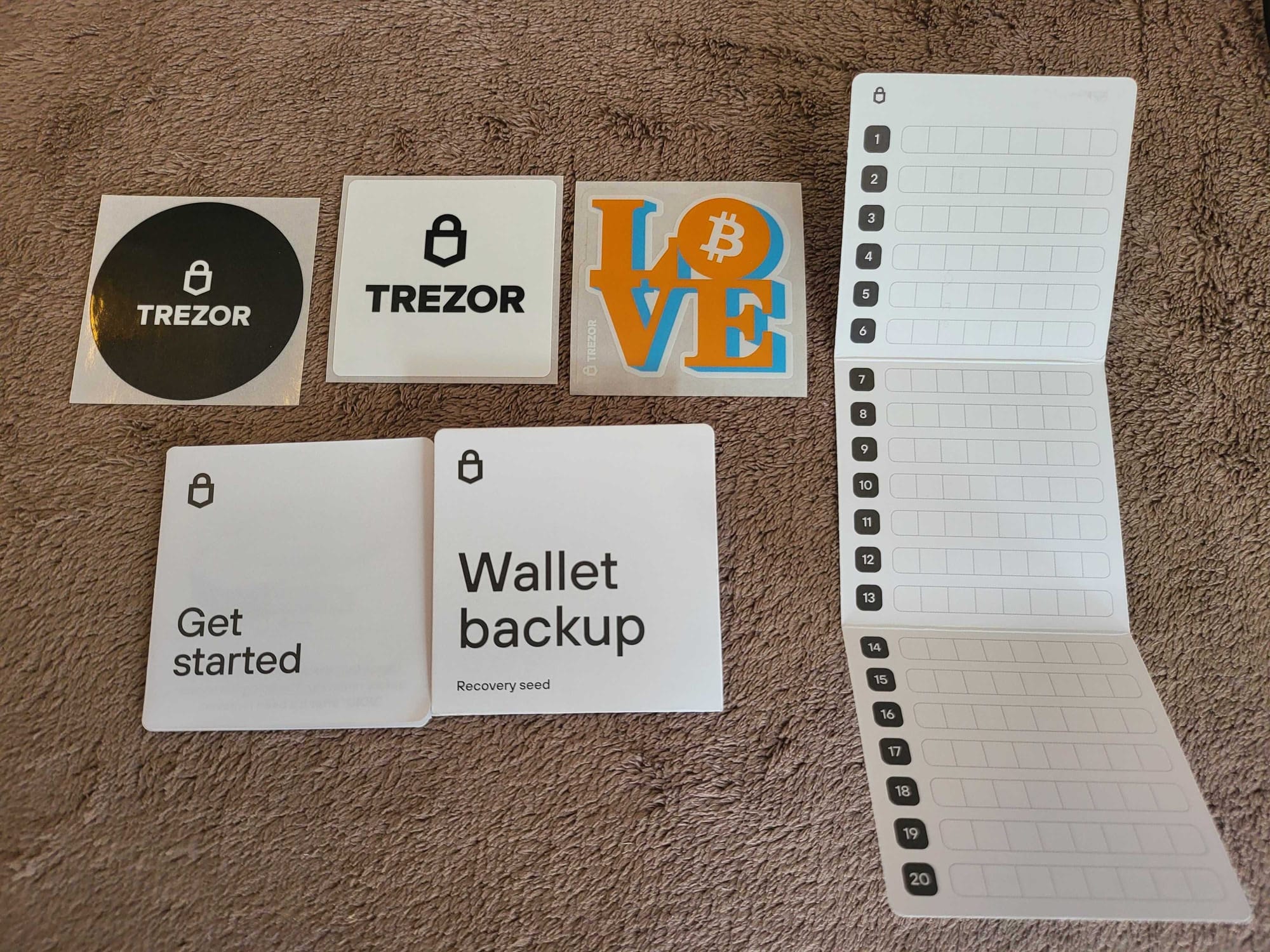 Wat krijg je dan binnen? In het doosje van de Trezor 5 Safe zit uiteraard de hardware wallet en een korte beschrijving, met een paar stickers en twee handige kartonnetjes om jouw wallet seed phrase op te schrijven. Sla jouw seed phrase nooit digitaal op.