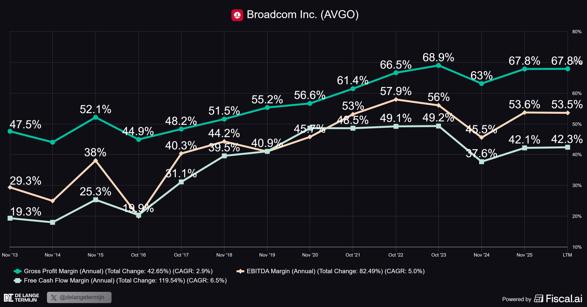 De afgelopen jaren zijn die hard opgelopen. Brutomarge rond de 67%, FCF-marge boven de 40% en EBITDA-marges die richting de 60% tot 70% gaan.