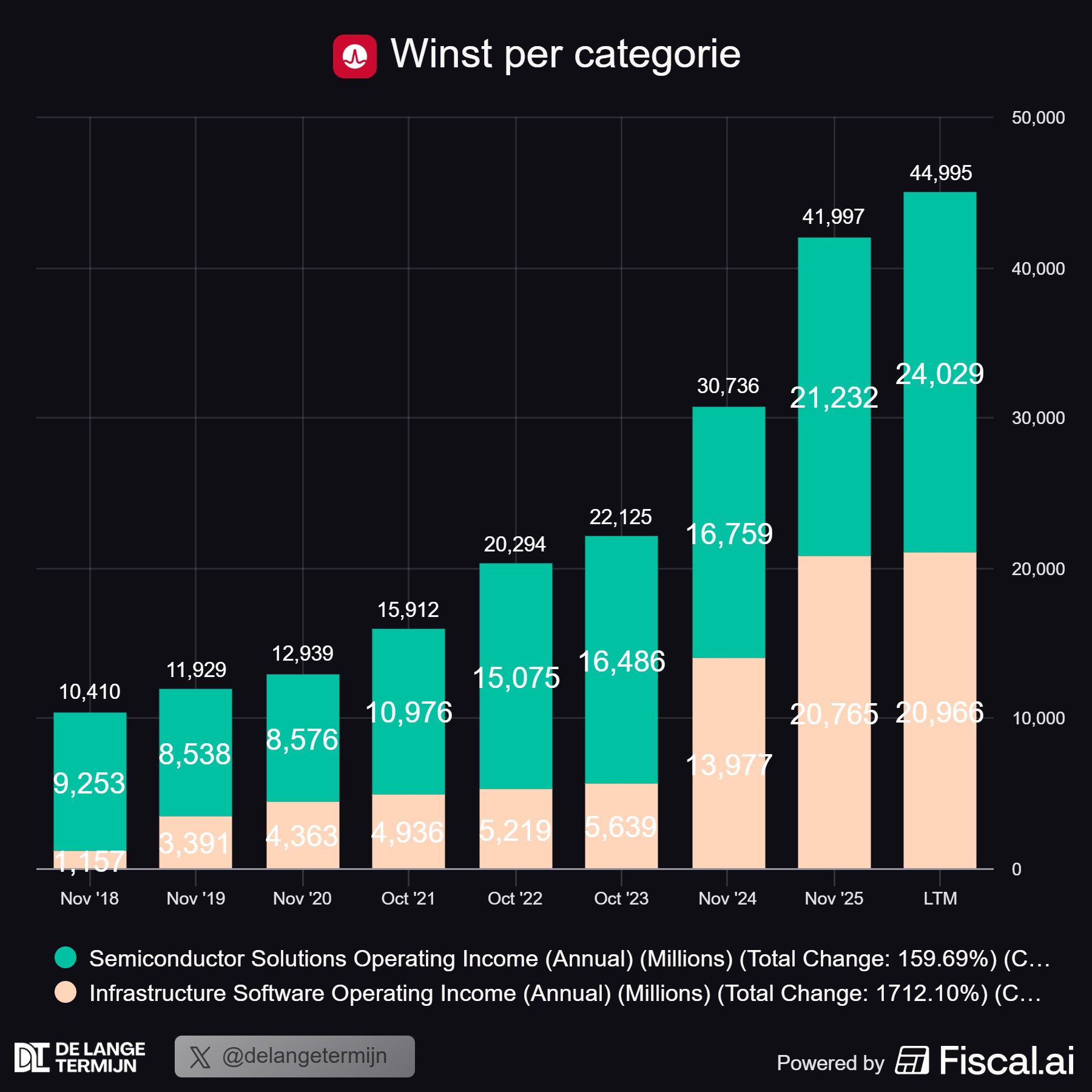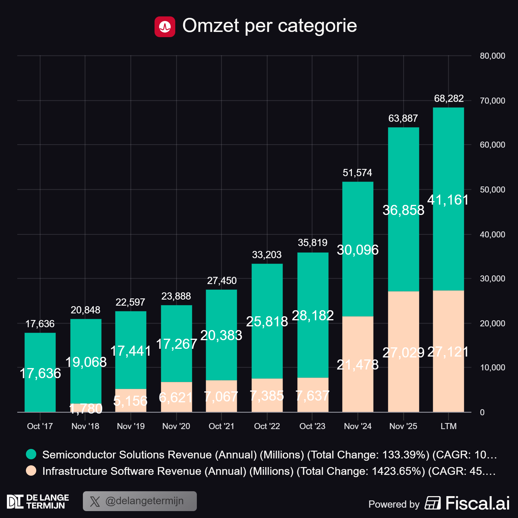 Aan de andere kant hebben ze een softwaretak, vooral dankzij de overname van VMware. En dat is eigenlijk de echte cashmachine van het verhaal. Minder dan 40% van de omzet komt uit software, maar meer dan 53% van de nettowinst.