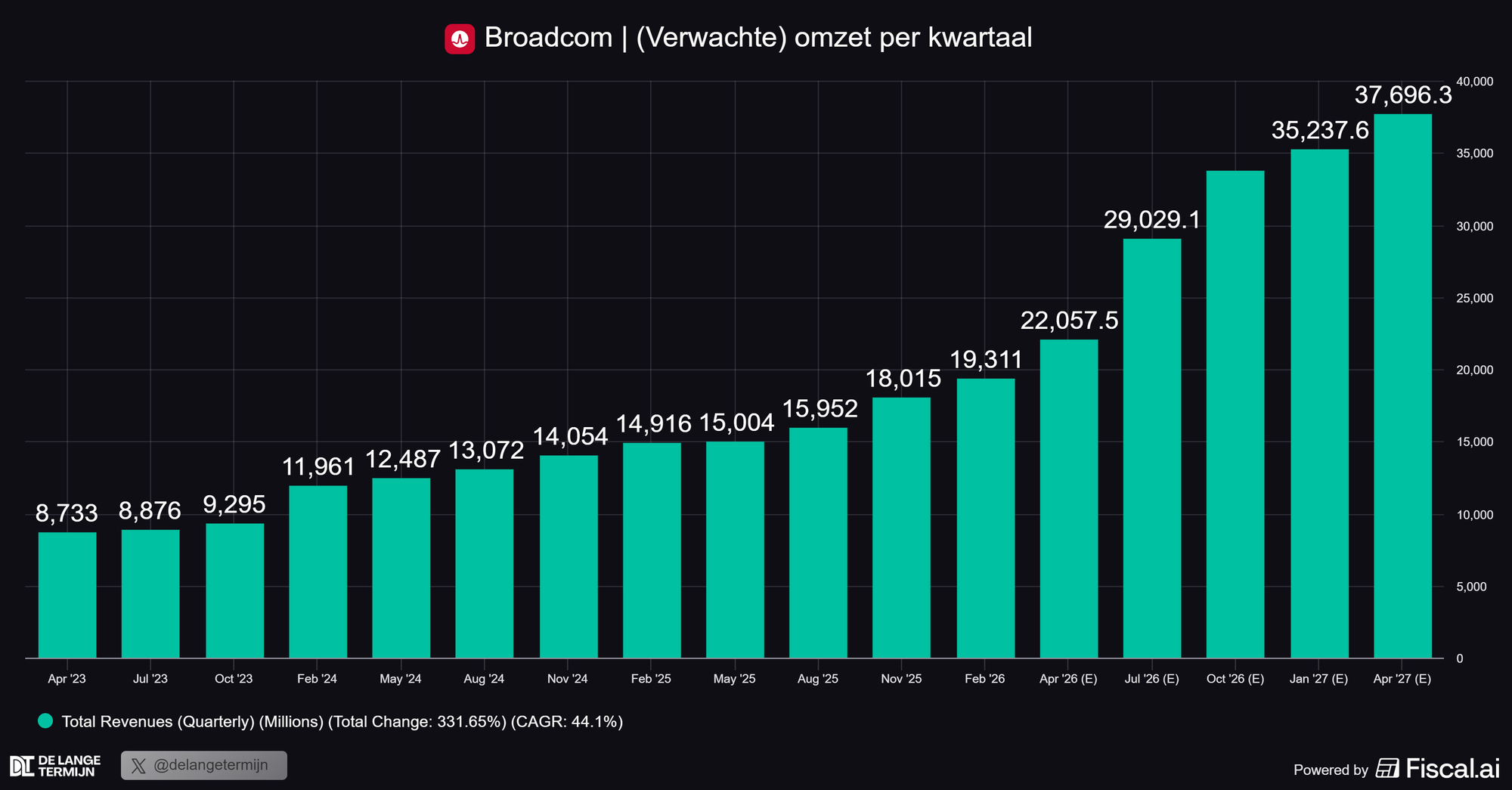 Voor het volgende kwartaal verwacht Broadcom zo’n $10,7 miljard aan AI-chipomzet, op een totale omzet van ongeveer $22 miljard. Dat betekent 47% groei op jaarbasis. Voor een bedrijf van deze omvang is dat absurd sterk.