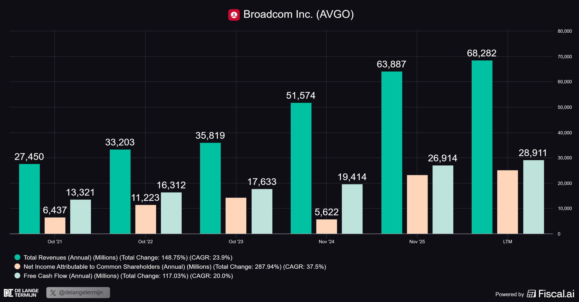 - De Free Cash Flow blijft wat achter en groeit “maar” 7,4% naar $28,9 miljard. Dat klinkt misschien alsof er iets hapert, maar dat valt mee. Dit komt vooral door de overname van VMware en investeringen om die AI-vraag bij te benen. Dat is dus eerder bouwen aan capaciteit dan een zwakker businessmodel.