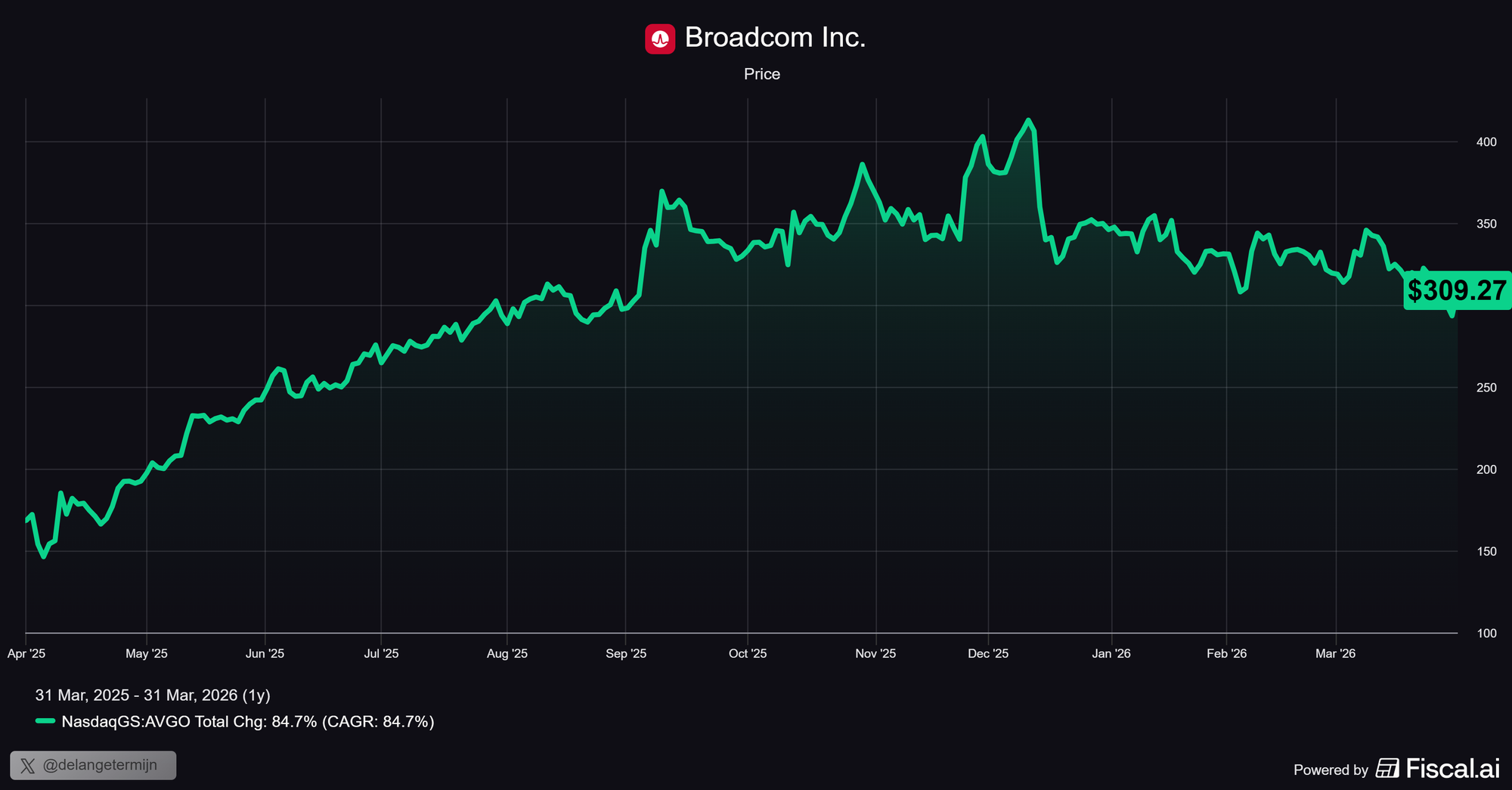 En toch staat AVGO sinds begin dit jaar al bijna 16% lager, naar een koers van $293 dollar. In een periode waarin het bedrijf zijn sterkste resultaten ooit neerzette.