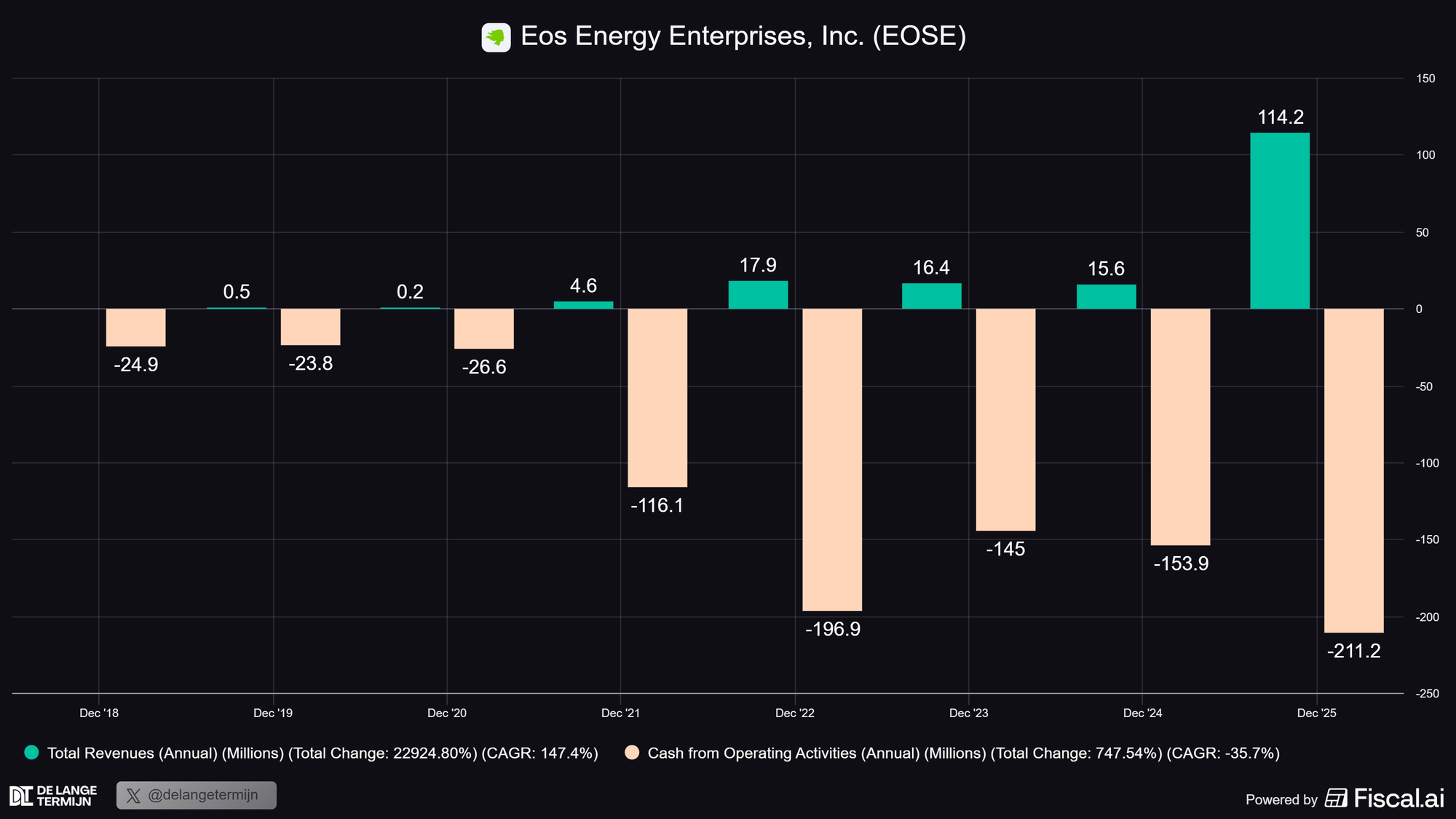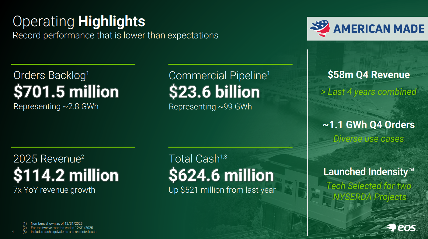 EOS rapporteerde vorige week over het volledige jaar 2025. De omzetgroei is sterk: van $15,6 miljoen in 2024 naar $114,2 miljoen in 2025. Meer dan zeven keer zo groot. Klantleveringen stegen 609%.