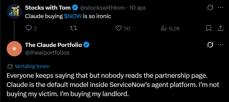 Ironisch genoeg is ServiceNow een van de grootste posities in het Claude Portfolio, met het argument dat de waardering compleet losgekoppeld is van de prestaties van het bedrijf zelf. En zolang dat zo blijft, en je niet alsnog de omzet en winsten ziet afnemen in de toekomst, zijn dit soms unieke kansen die de markt je biedt.