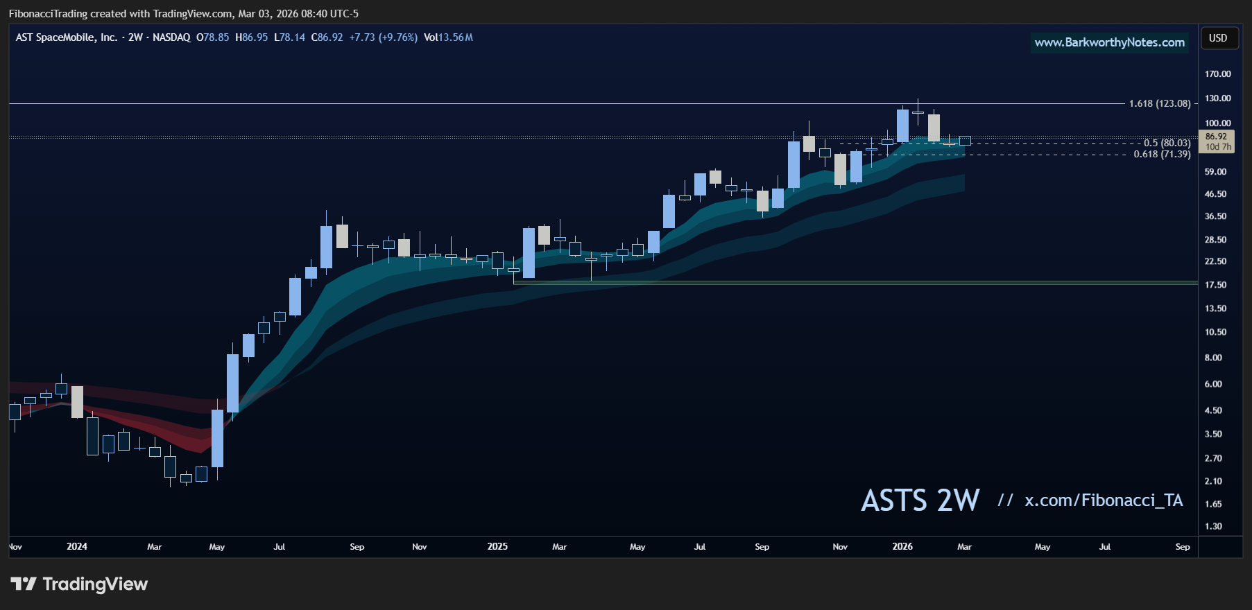 Ik heb de $80 tot $70 zone ingetekend die voor mij koopwaardig is. De koers zit nu op $86, dus we zitten er net boven. Maar instappen tussen $70 en $80 heeft op dit moment mijn voorkeur.