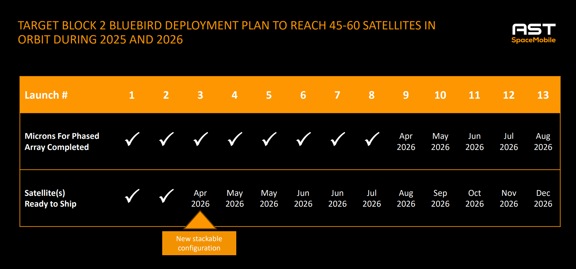 De batch-lancering was wel een kleine tegenvaller: die staat nu gepland voor april 2026 in plaats van eerder dit kwartaal. Einde Q1 heeft AST naar verwachting slechts twee Block 2 BlueBirds gelanceerd. Om de doelstelling van 45 tot 60 satellieten einde 2026 te halen, moet de rest van het jaar dus fors worden opgeschaald.