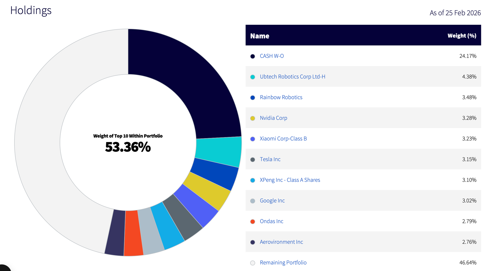 Denk aan humanoid robots in het huishouden en fabrieken, autonome drones voor bezorging en slimme logistiek in distributiecentra. Het fonds spreidt over ruim 40 bedrijven wereldwijd, met een nadruk op de VS, China en Japan.