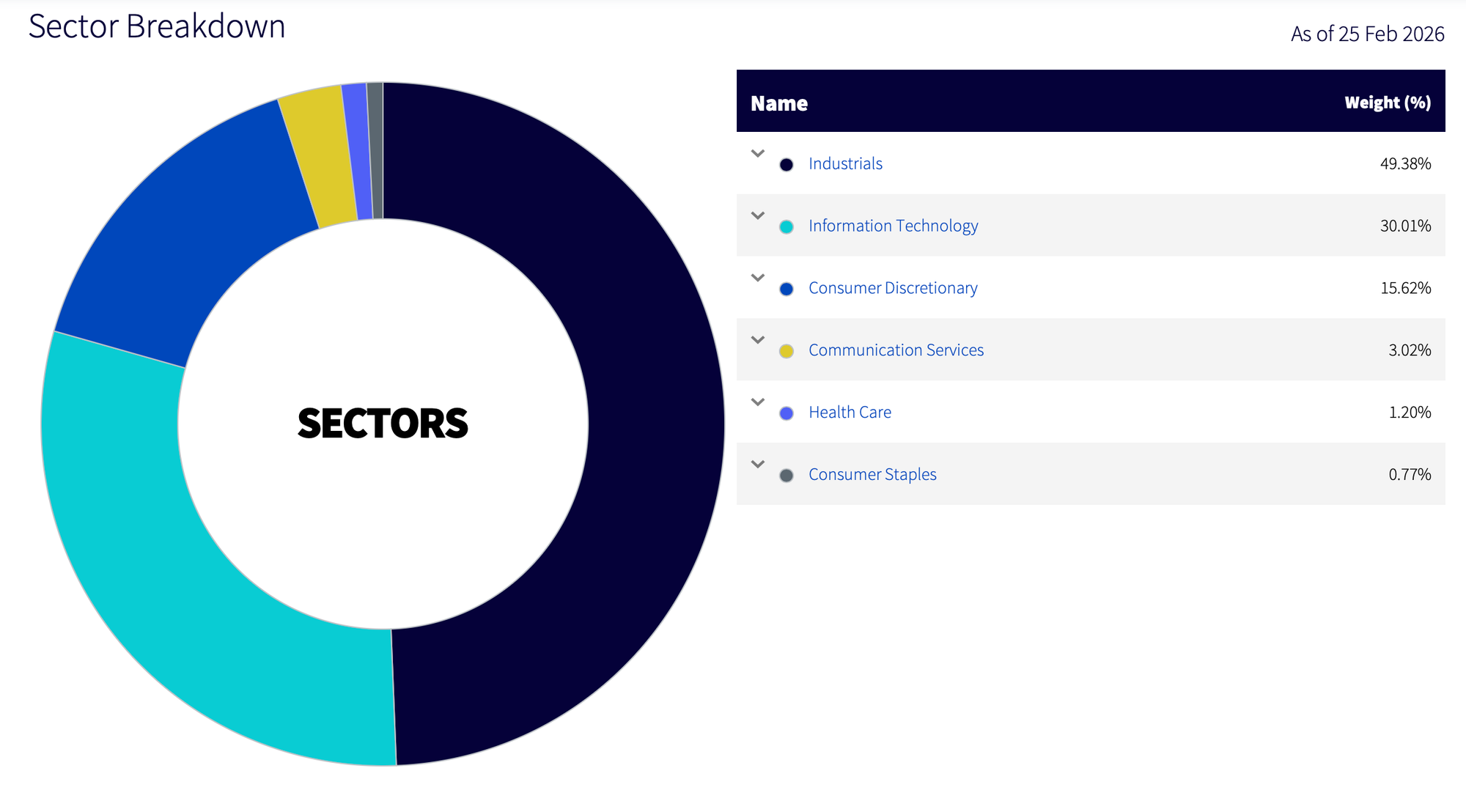 Het is opvallend dat de sectorverdeling flink verschilt van een klassieke AI-ETF: zo'n 50% zit in industrials en 30% in information technology.