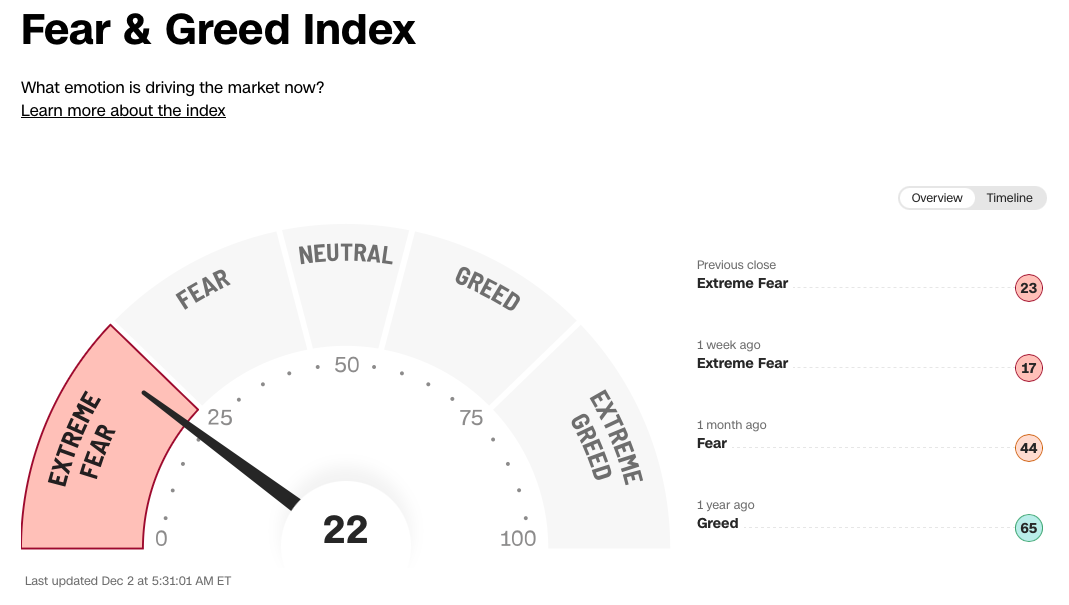 Het zal je vast opgevallen zijn hoe extreem de kloof is tussen het algehele gevoel en de feiten. De bekende Fear & Greed Index van CNN stond eind november in “extreme fear” met een stand rond de 24. Dat is een niveau dat je normaal gesproken eerder bij crashes dan bij recordstanden ziet.