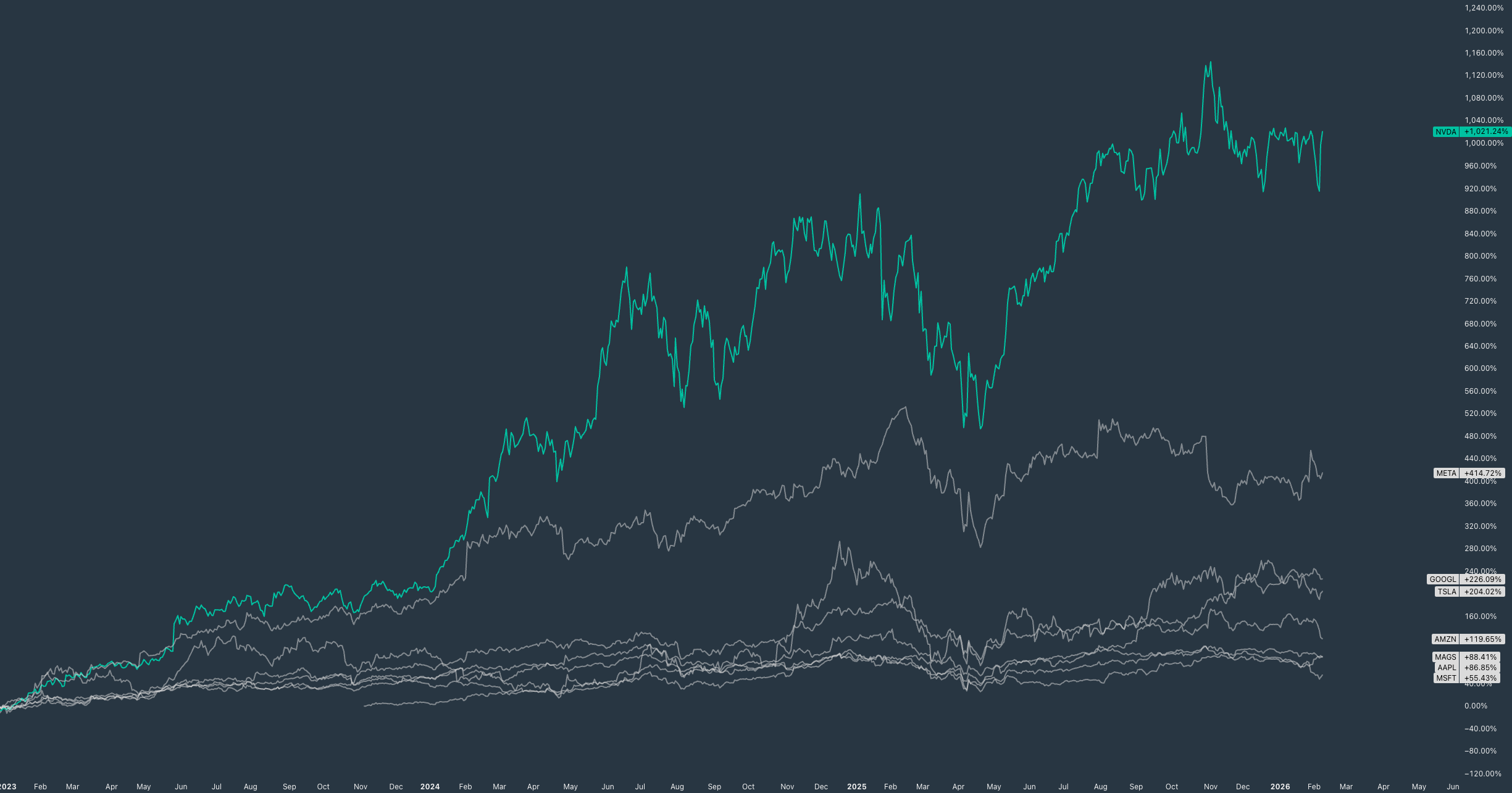 De winnaar blijft niet geheel verrassend Nvidia, met 1.000% koerswinst. Gevolgd door Meta (+414%).