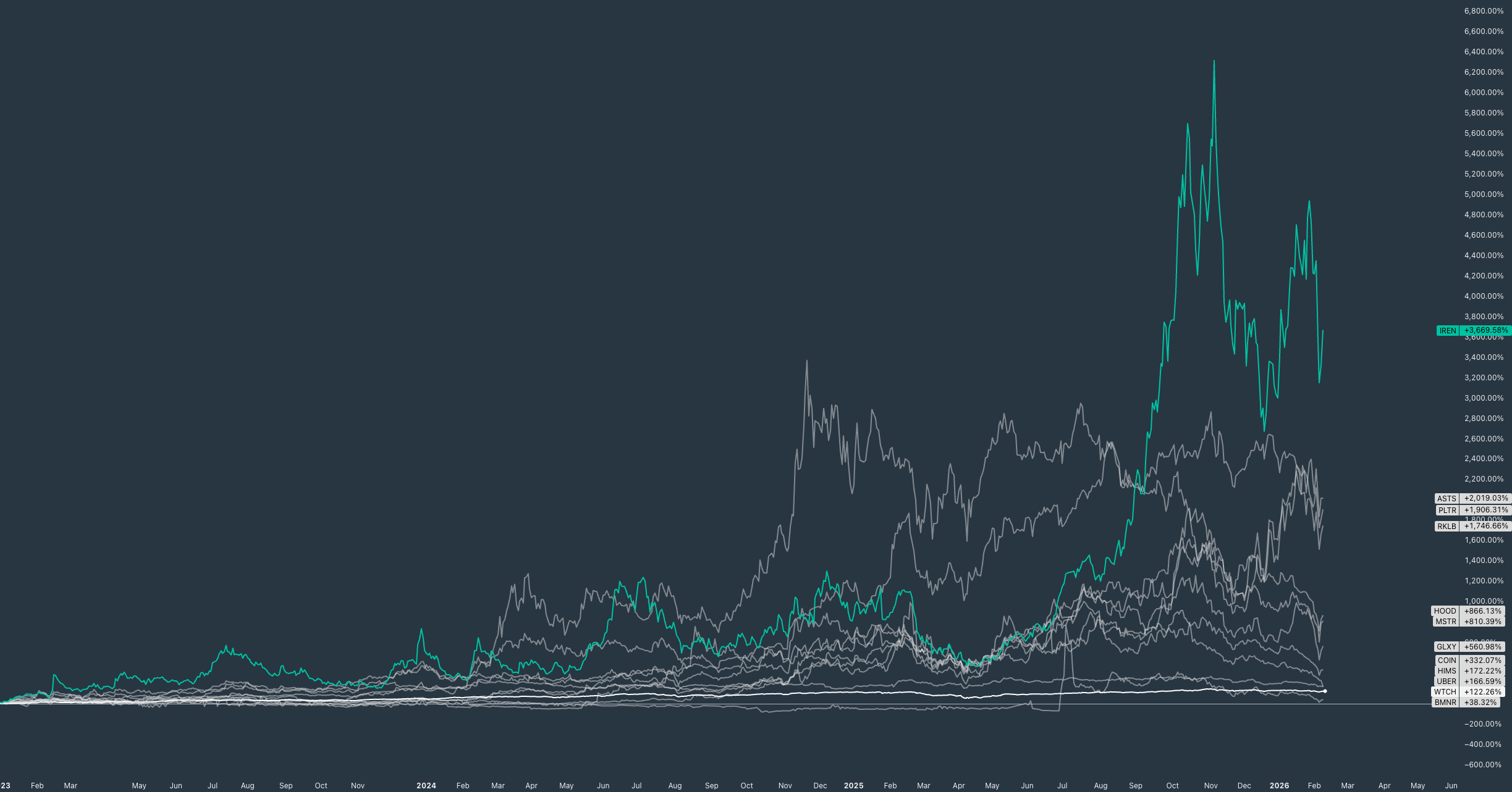 Vervolgens schuiven we op naar de individuele groeiaandelen buiten de Mag7, waar enkele echte raketten laten zien dat “outsized returns” allang niet meer exclusief tot o.a. crypto beperkt zijn.