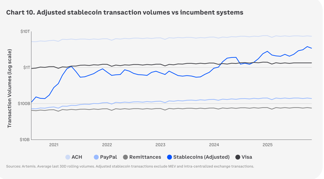 Er is geen enkel rapport dat eraan twijfelt dat de adoptie van stablecoins in 2026 verder zal accelereren. Binance vermeldde bijvoorbeeld al dat de stablecoinmarkt in 2025 met ruim 50% groeide, en dat stablecoins qua transactievolume inmiddels ver voorbij Visa zijn gegaan.