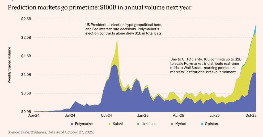 Coinbase verwacht dat de stablecoinmarkt tegen 2028 kan uitgroeien tot ongeveer $1,2 biljoen. 21Shares gaat nog een stap verder en stelt dat de totale waarde van stablecoins eind 2026 al de kaap van $1 biljoen kan bereiken.