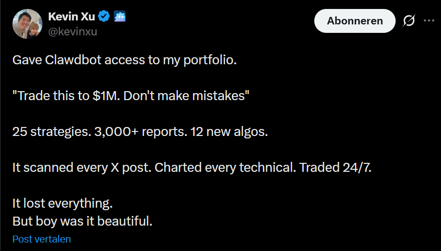 Voor bepaalde taken lijken AI agents echter nog niet klaar voor prime time. Traden is voorlopig absoluut niet hun sterkste kant. Bij het automatiseren van trading bots valt geregeld op dat marktsignalen verkeerd geïnterpreteerd worden. Ze kunnen dan wel razendsnel data analyseren, maar de beslissingen die daaruit voortkomen zijn soms allesbehalve accuraat.