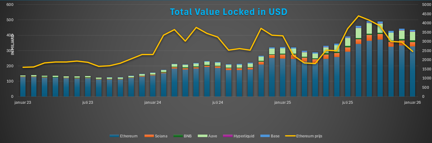 Alle chains samen bekeken zijn we in januari iets achteruitgegaan ten opzichte van december. Deze daling was echter ontzettend miniem (-2%). Dit terwijl de prijs van Ethereum een klap kreeg van net geen 20%.