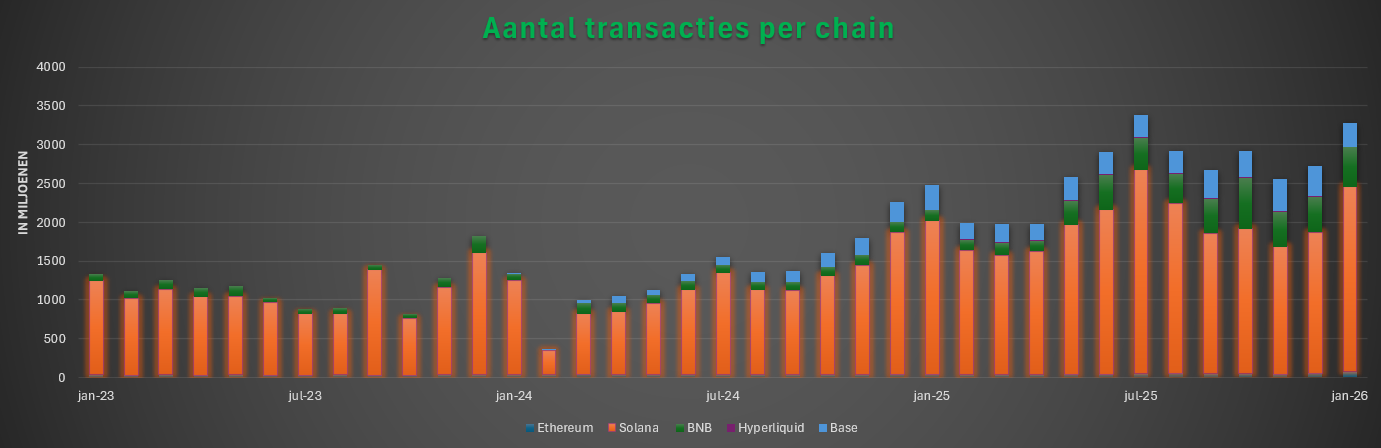 Januari was enorm sterk wanneer het ging over het aantal transacties. Ethereum (+35 procent), BNB (+12 procent) en Solana (+27 procent) gingen er hard op vooruit ten opzichte van december. Base (-25 procent) en Hyperliquid (-22 procent) kregen hier wel klappen.