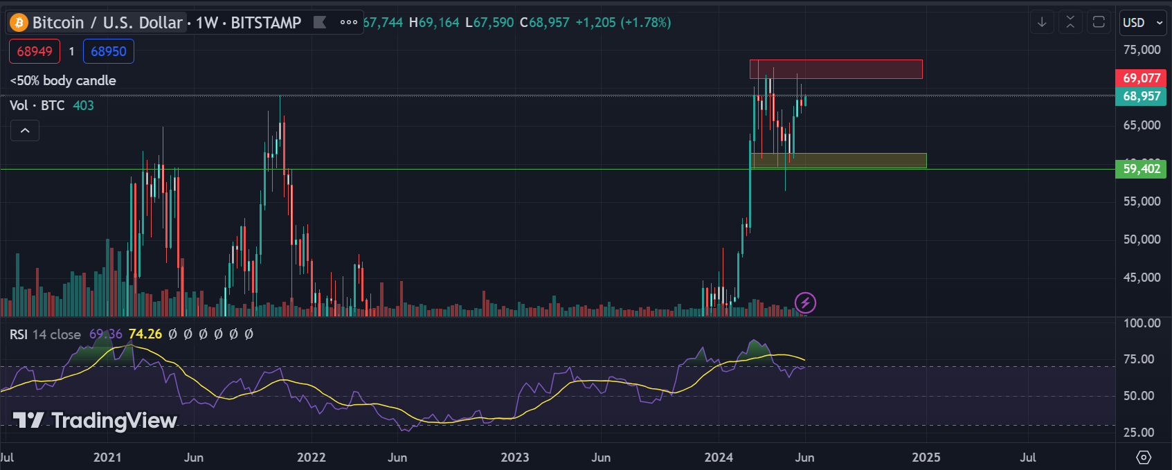 Een snelle kijk op weekly chart van Bitcoin leert ons dat sinds een snelle stijging tussen begin febuari en begin maart, we nu redelijk zijwaarts bewegen. Er was even een beetje angst toen Btc onder het 59-60K level dook eind april, maar dat is achteraf een kleine shakeout gebleken. Sinds dat moment laat Bitcoin weer sterkte zien en heeft het opnieuw de top van de range proberen breken. Momenteel stagneren we rond de ATH van 2021 en is het afwachten of Bitcoin deze week opnieuw een poging onderneemt om de zone tussen 71-73K te breken.