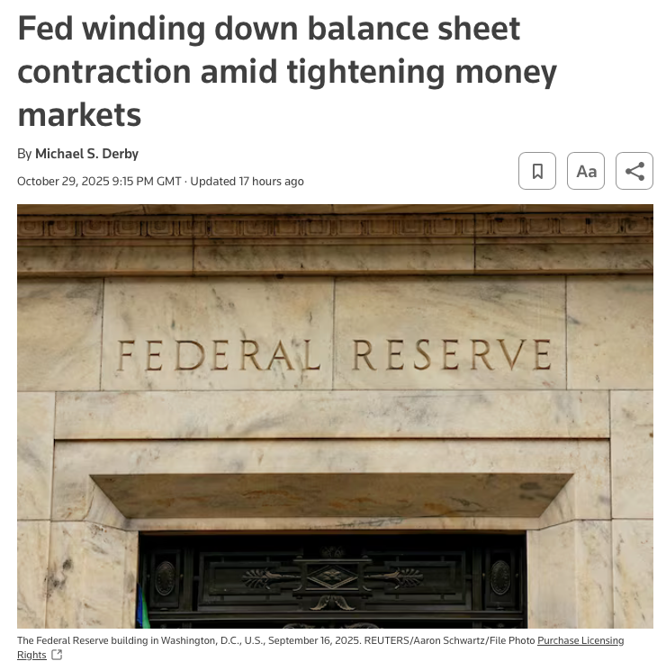 Tegelijkertijd verlaagde de Fed de rente met 0,25 procentpunt naar een bandbreedte van 3,75% tot 4%. Deze beweging markeert het einde van drie jaar quantitative tightening (QT) en kondigt mogelijk een nieuwe fase van milde balansuitbreiding aan.