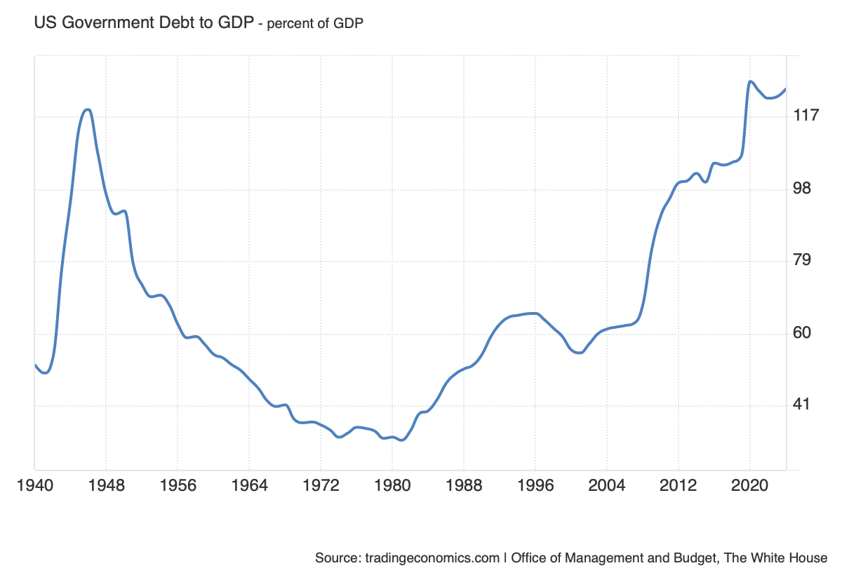 - De schuld-tot-BBP ratio van de VS nu 124% is en kritieke niveaus benadert.