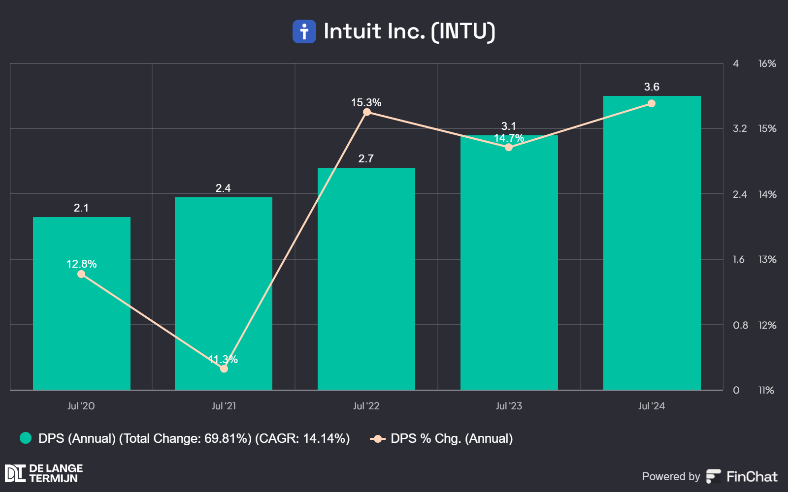 Intuit betaalt een bescheiden dividend, maar heeft de uitkering de afgelopen jaren wel structureel verhoogd. Ze hebben een gezonde payout ratio, en de waardering is - net als bij Wolters Kluwer - prima in verhouding tot hun groei, maar niet goedkoop.