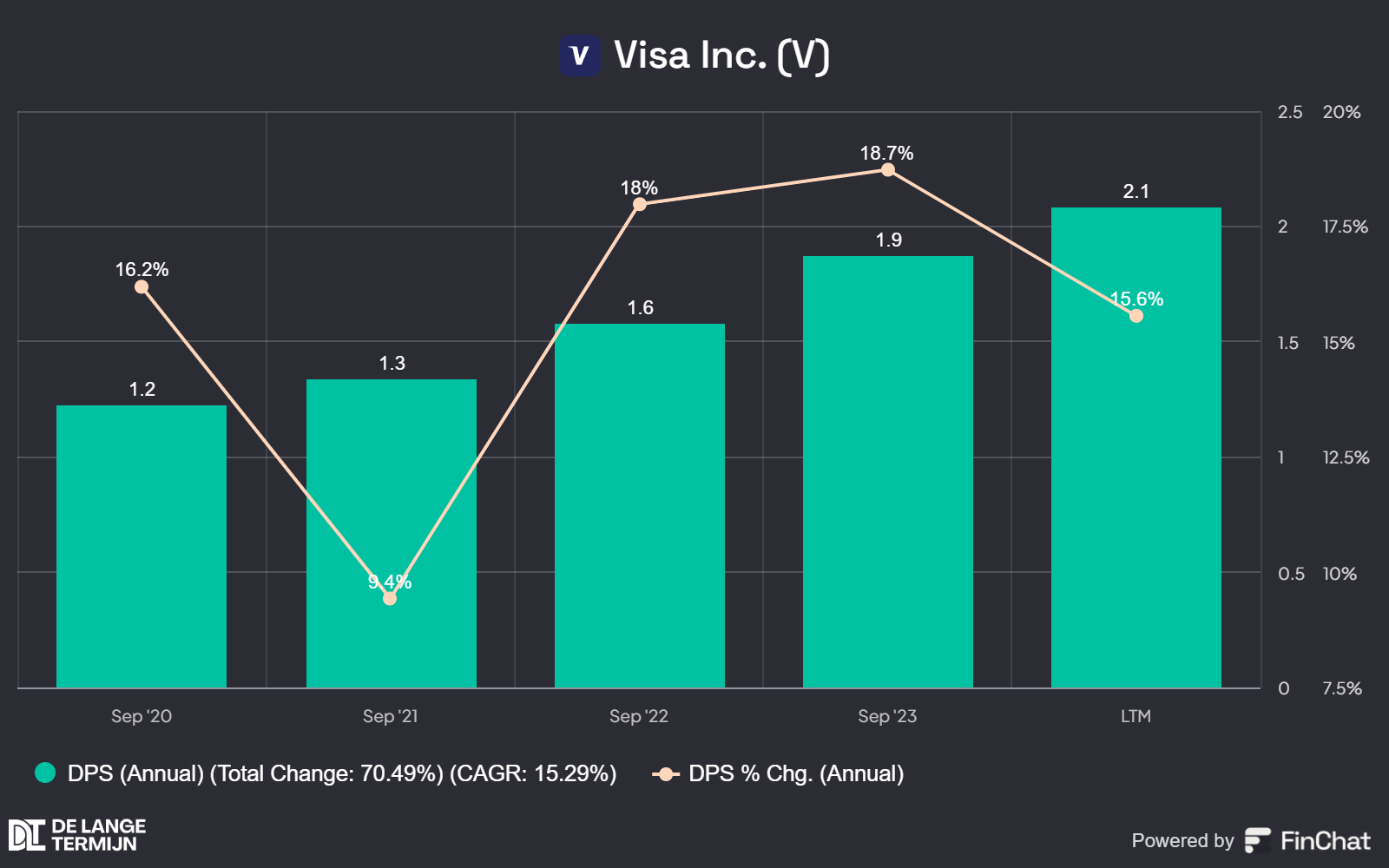 Dit is een aandeel dat waarschijnlijk een toekomstige 'dividend aristocrat' wordt, de trotse benaming voor bedrijven die hun dividend 25 jaar lang hebben verhoogd. Visa zit momenteel op 16 jaar en het bedrijf presteert uitstekend.