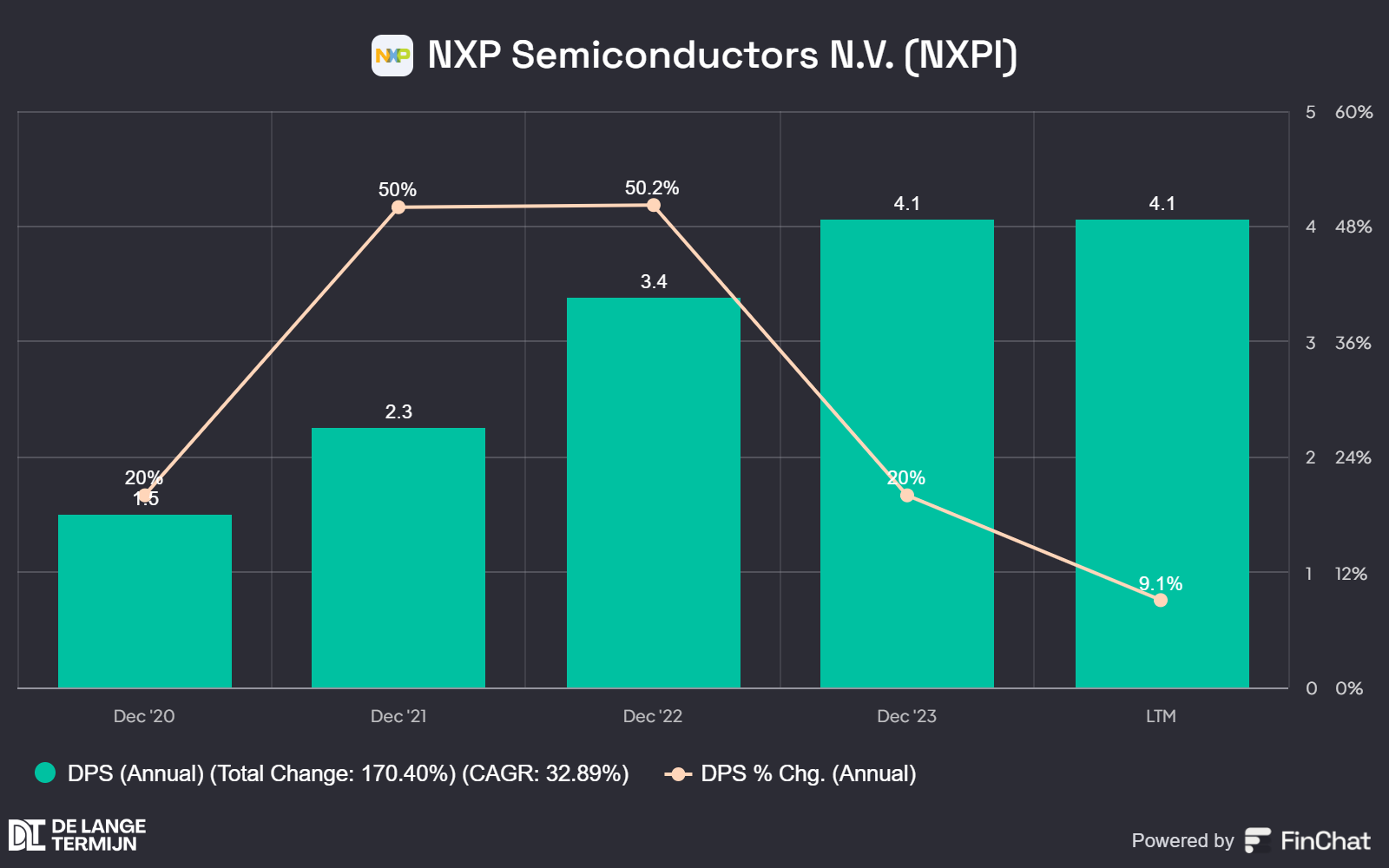 Visa en NXP Semiconductors blinken uit met sterke groei in zowel dividend (15,8% en 32,3%) als winst per aandeel (23,6% en 43%), wat ze aantrekkelijk maakt voor dividendbeleggers.