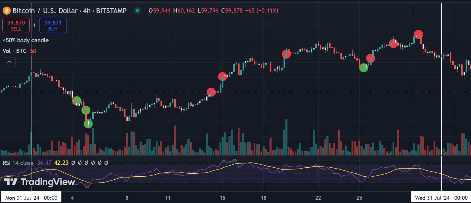 Op een chart (zie onder) ziet dat er uiteindelijk als volgt uit: de groene bolletjes zijn de momenten waarop een kooporder is geraakt en de rode bolletjes zijn de momenten waarop ik een stukje heb uitgeschaald.