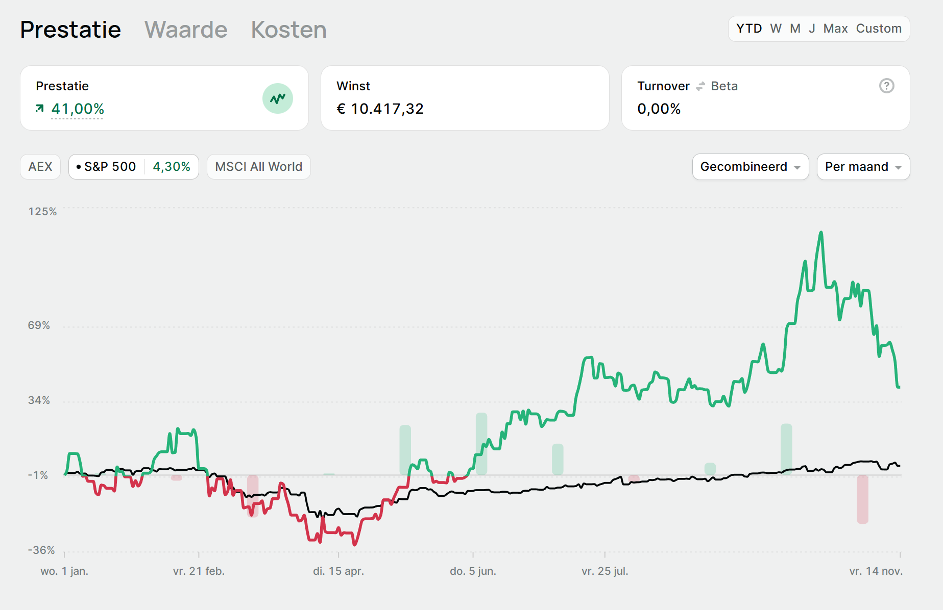 Het begon als een uitstekend jaar, maar inmiddels zakt het rendement behoorlijk terug. In slechts één maand tijd is het resultaat gezakt van +113% naar +41%.