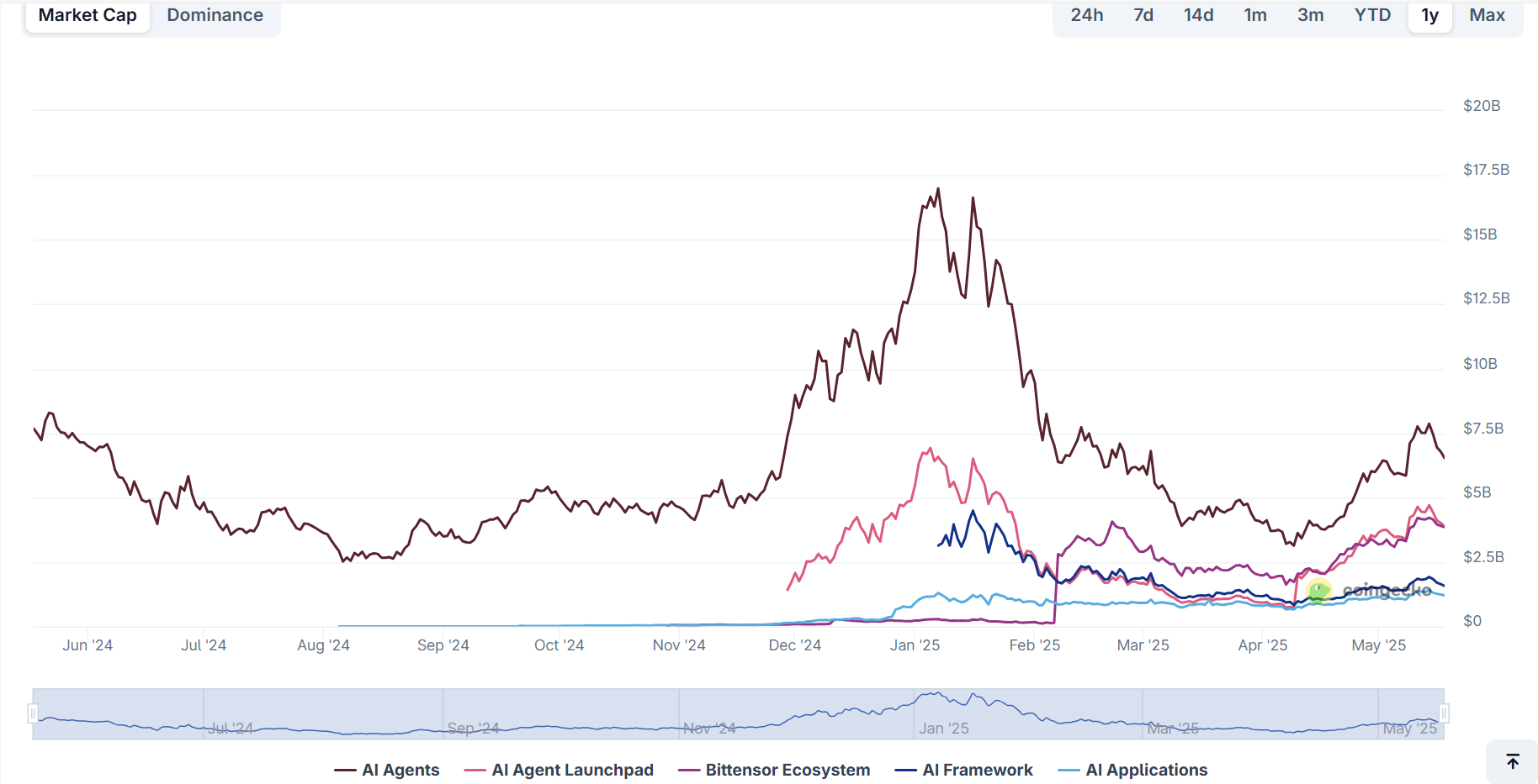 Het lijkt bijna onvoorstelbaar dat AI over vijf jaar nog steeds slechts 1% van de cryptomarkt zou uitmaken. Toch is dat moeilijk te voorspellen. De enorme fragmentatie binnen deze niche, gecombineerd met veel jonge projecten, maakt het lastiger (en risicovoller) om met vertrouwen projecten voor vijf jaar vast te houden.