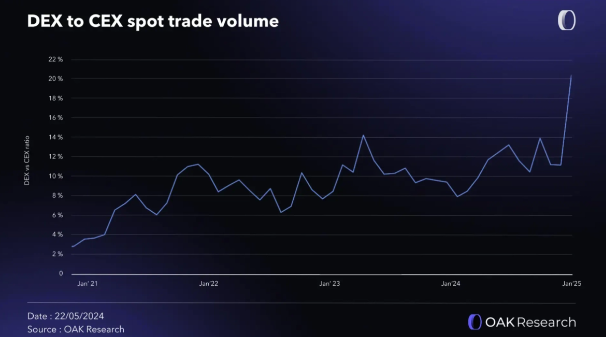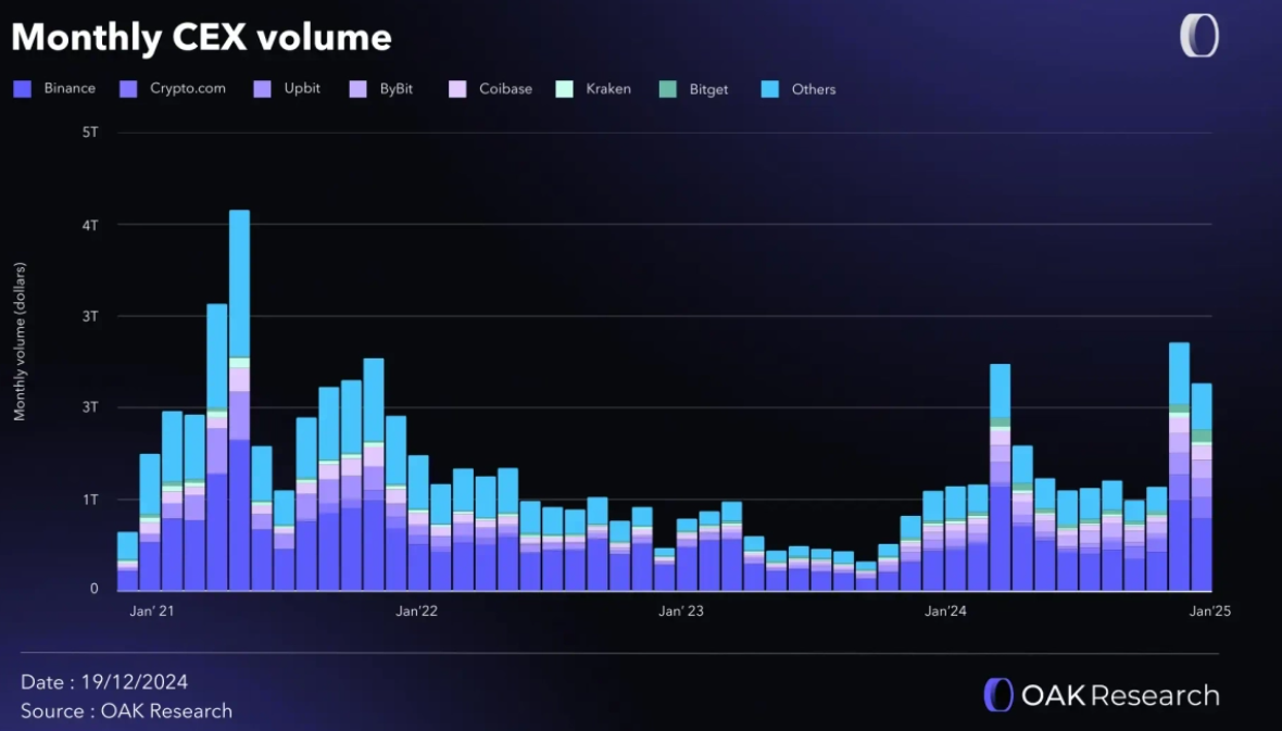 De grote inhaalbeweging eind vorig jaar had natuurlijk alles te maken met het Solana-memecoincasino dat zich afspeelde op de DEX’s. Centrale exchanges hadden het ondertussen lastig: de SEC zat hen op de hielen en de retail blijft in deze cyclus voorlopig grotendeels afwezig.