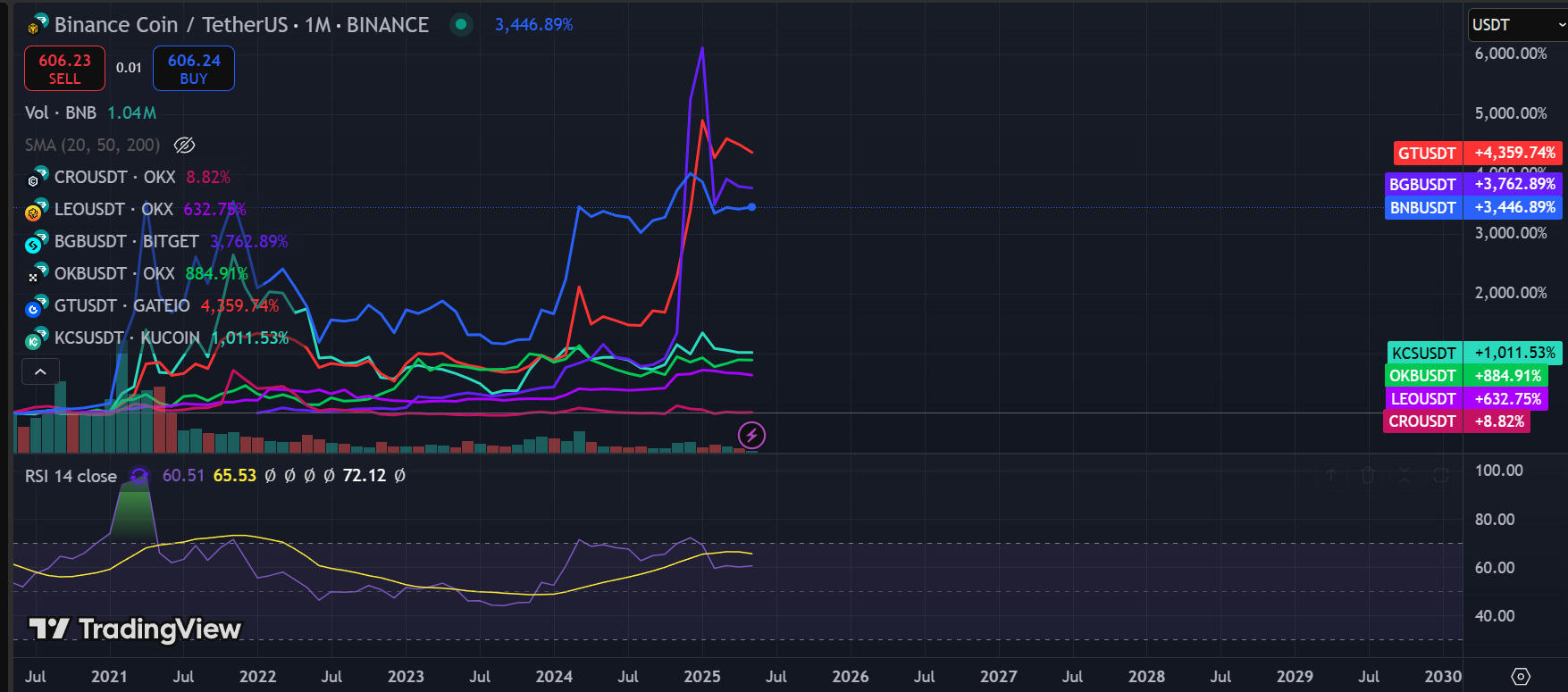 De onderstaande grafiek loopt van midden 2020 tot vandaag. Vanwege de enorme macht van Binance beginnen we daar, aangezien anders de andere tokens onzichtbaar zouden zijn.