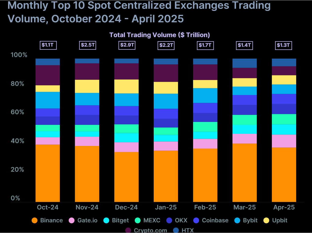 We zien hier duidelijk dat Binance marktleider is, maar dat hun marktaandeel wel volatiel is. Begin 2023 zitten ze bijvoorbeeld rond de 60% marktaandeel, terwijl dit eind 2024 rond de 35% ligt. Door reguleringen is Binance in de tussentijd vertrokken uit enkele landen, dus daar ligt ook een stukje verklaring.