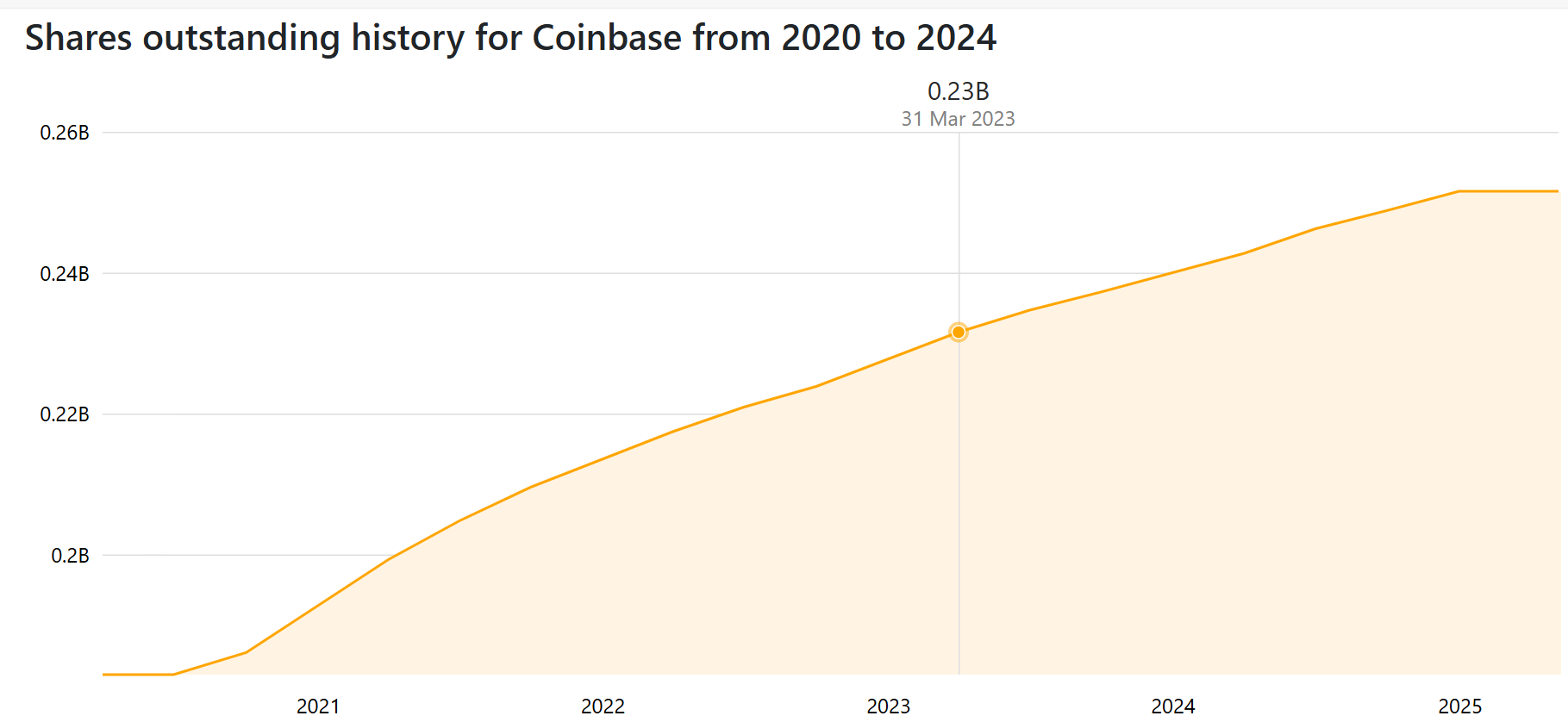 Coinbase is natuurlijk het buitenbeentje, aangezien dit bedrijf aandelen uitgeeft en geen eigen token. Interessant om te zien is dat het aantal uitstaande aandelen van 2020 tot 2025 gestaag bleef stijgen, maar nu op een plateau is gekomen.