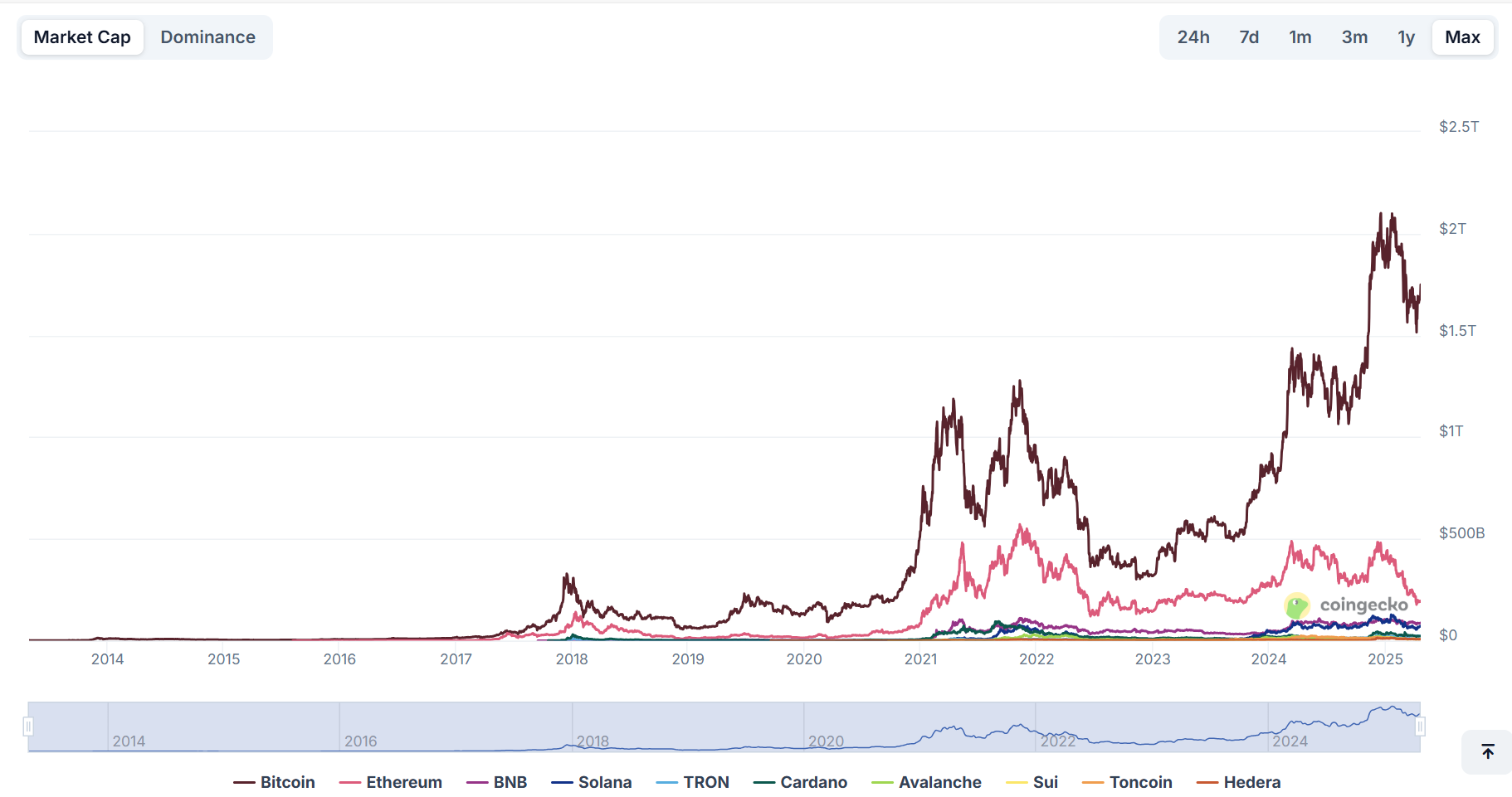 In de chart van Coingecko met een groot aantal verschillende layer 1's ziet dat er als volgt uit: