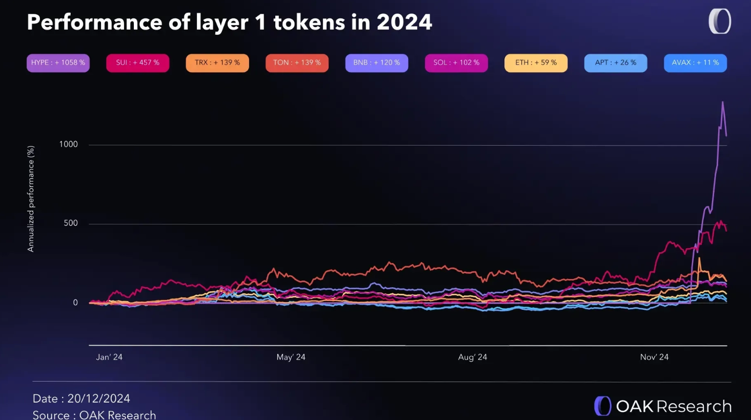 Twee grote winnaars zijn overduidelijk Hyperliquid en Sui, maar ook Tron en Toncoin hebben het in 2024 beter gedaan dan Bitcoin. Aan de onderkant van het spectrum vinden we Avalanche, Aptos en Ethereum.