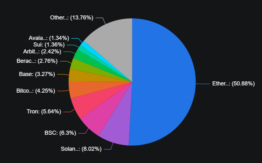 De laatste 30 dagen is Tron hier de winnaar met 10 straatlengtes voorsprong op Solana en Ethereum. Het is ook niet verrassend aangezien USDT naar ongekende hoogtes blijft stijgen.