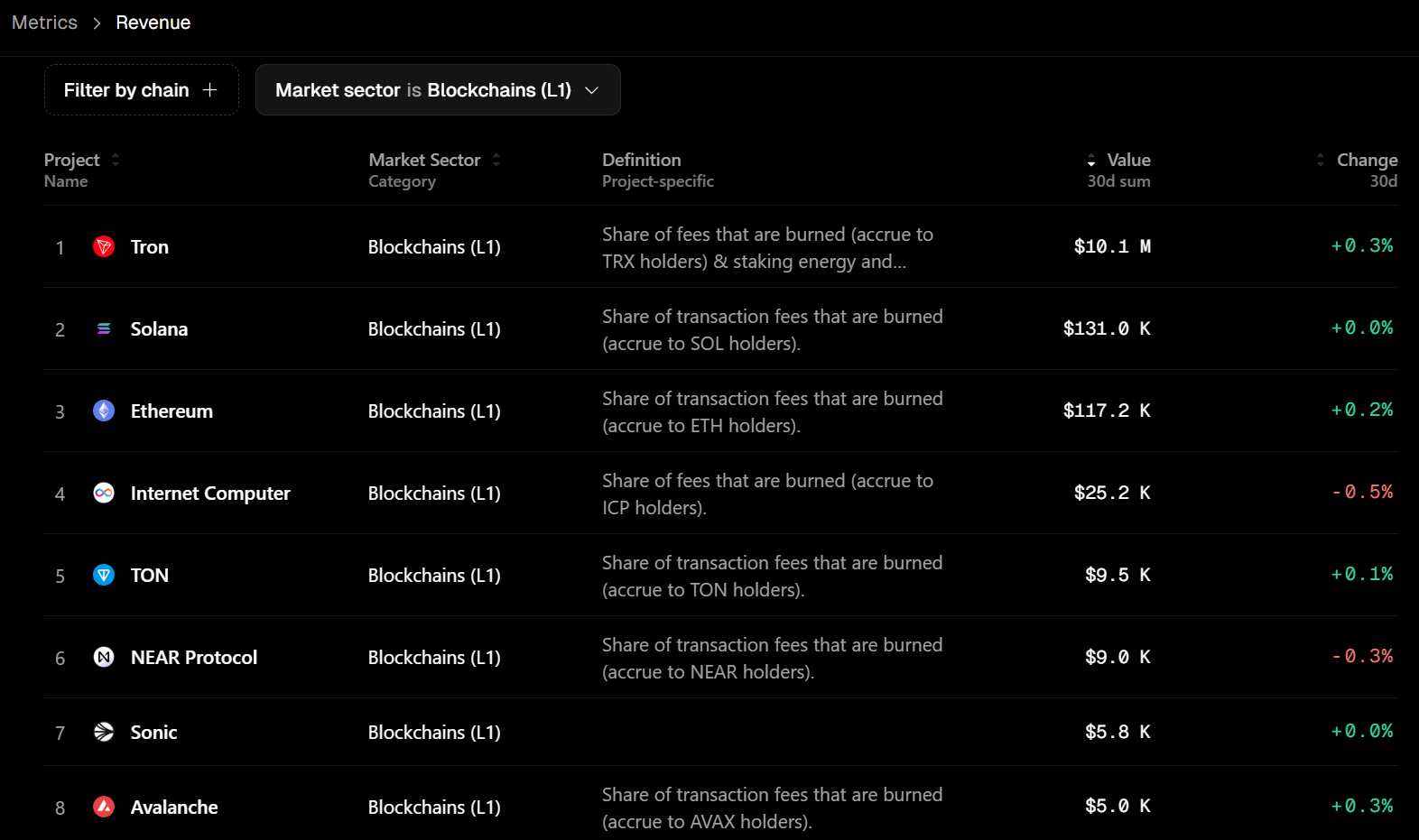 Niet alleen van aandelen kun je de omzet vinden, maar ook van layer-1's is die openbaar terug te vinden. Het wil namelijk niet zeggen dat je de hoogste TVL hebt of de meeste transacties, dat je daarmee ook gegarandeerd de grootste omzet draait.