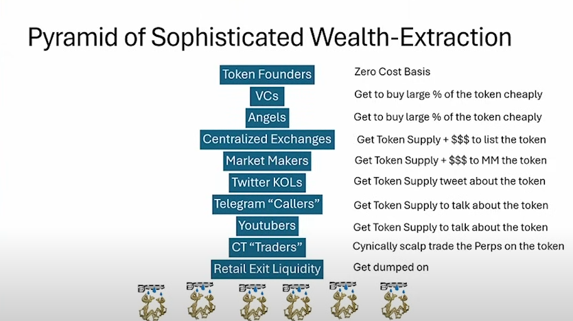 Je hebt dan ook nog talloze projecten die enorme unlocks voor de boeg hebben (Binance becijferde dat dit de komende 5 jaar rond de 150 miljard USD zal zijn), waardoor er extra verkoopdruk komt die retail maar moet zien op te vangen. Het is eigenlijk een spel dat retail gewoon niet kan winnen van VC’s, omdat je met zo’n enorme achterstand begint — iets wat veel mensen zich niet eens realiseren.