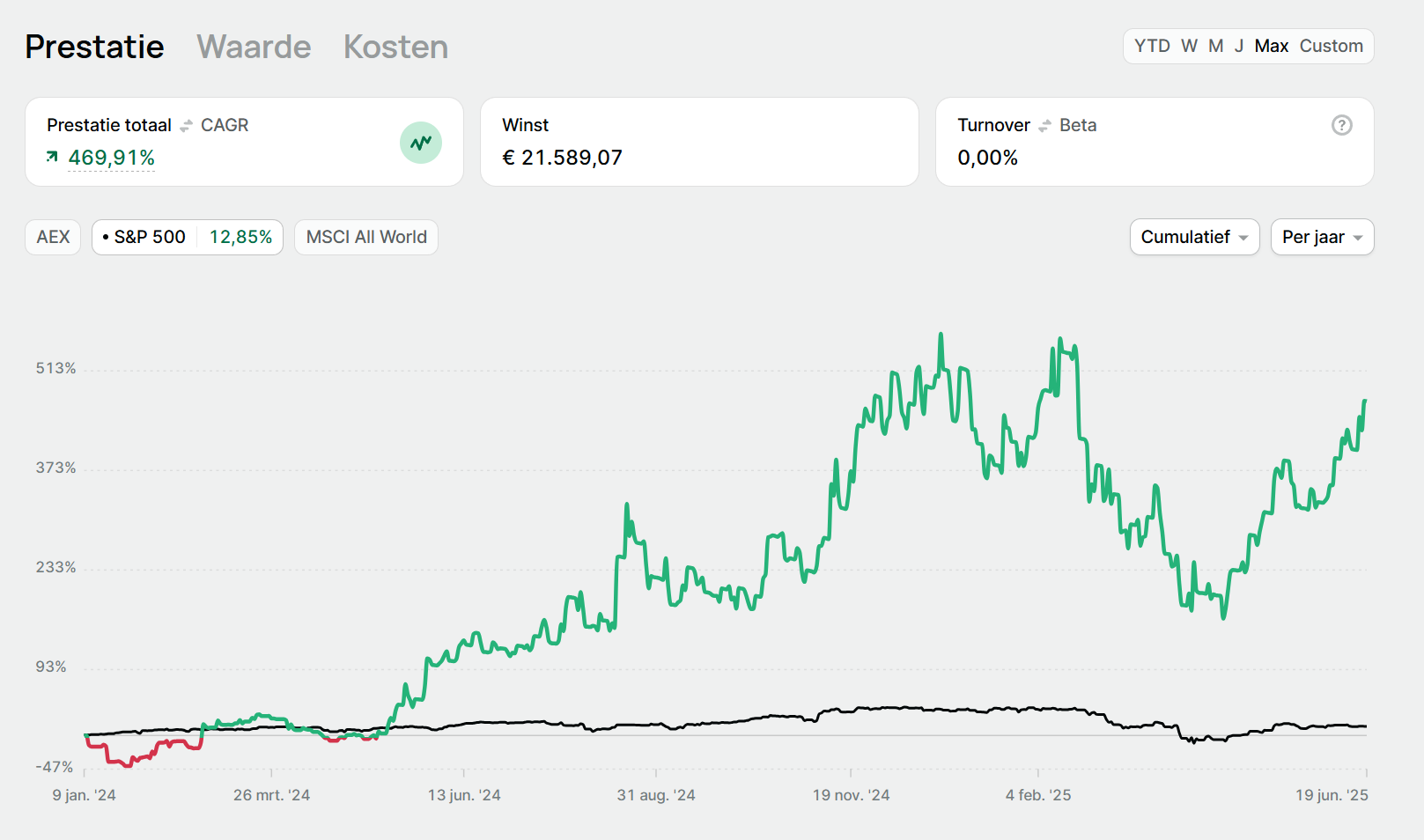 Maar die periode liet óók zien hoe heftig zo’n portfolio kan bewegen. Tussen februari en april daalde het rendement van +560% naar +164%. Een gigantische klap. En als jij toen net was ingestapt, stond je nu nog steeds in de min.