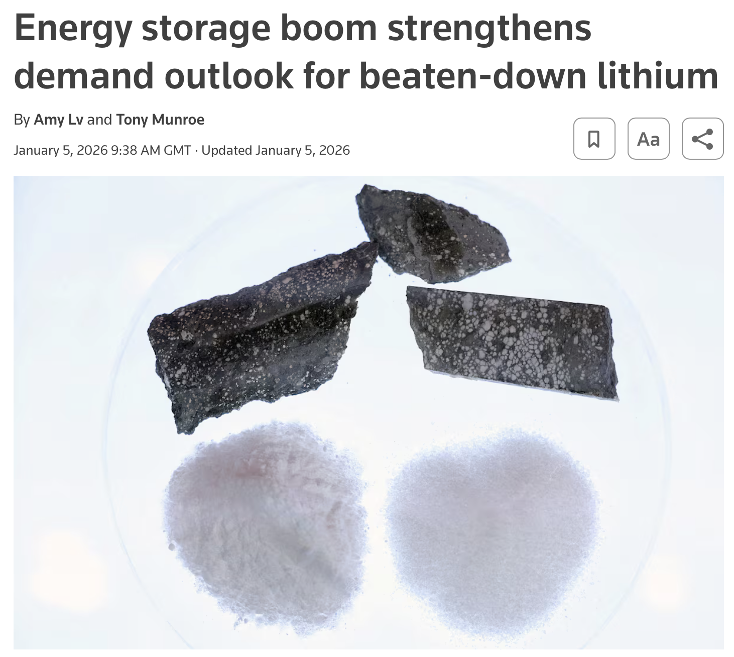 Energieopslagsystemen - grote batterijparken die ons stroomnet stabiliseren - vreten lithium. Reuters berekende dat de lithiumvraag uit energieopslag in 2026 met 55% groeit, bovenop een sprong van 71% in 2025. Broker Guotai Junan verwacht dat energieopslag in 2026 al goed is voor 31% van alle lithiumvraag, tegenover 23% in 2025.