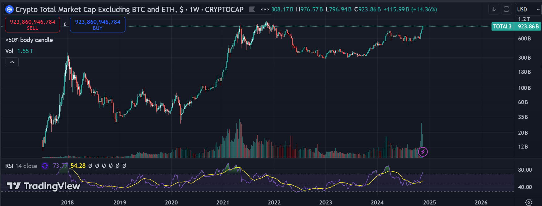 "History doesn't repeat itself, but it often rhymes." Een quote die je maar al te vaak voorbij ziet komen, maar het verleden kan je wel een goed idee geven over hoe de toekomst eruit zou kunnen zien. Wanneer je in Tradingview 'Total3' ingeeft, zie je de market cap van alle Altcoins, uitgezonderd Bitcoin en Ethereum.