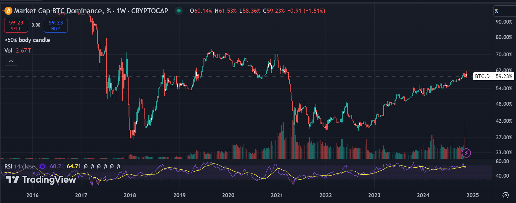 De chart die ons daarbij het beste helpt, is de Bitcoin-dominantie chart.