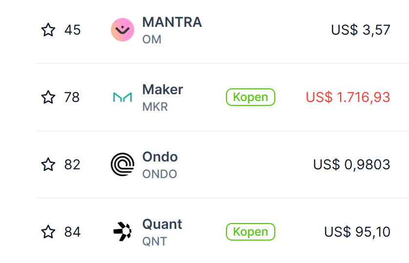 Real World Asset-coins zijn tokens die een tastbare asset buiten de digitale wereld vertegenwoordigen, zoals gebouwen, machines of obligaties. Het idee hierachter is dat eigenaarschap wordt vastgelegd op de blockchain. In de vorige cycle zagen we een gekte rondom NFT’s; misschien gaat deze cycle verder dan eigenaarschap van digitale zaken. Wat het extra interessant maakt, is dat BlackRock hierachter de schermen mee bezig is.