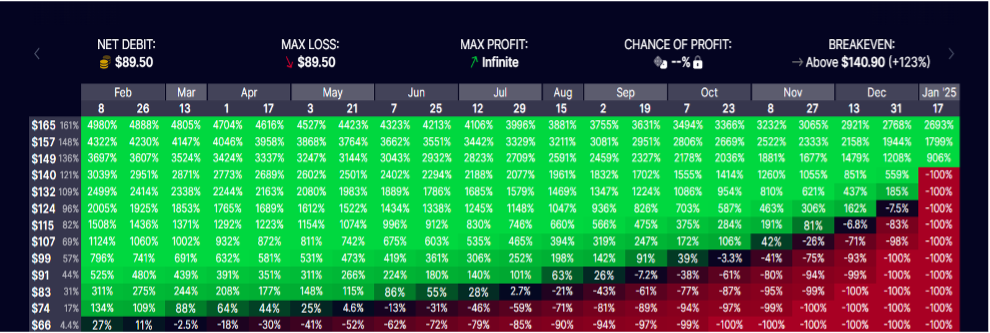 De onderstaande tabel is gemaakt via optionstrat.com, een site die ik vaak gebruik voor het uitwerken van leap opties en de mogelijke winsten en verliezen in kaart te brengen. Het is wellicht even puzzelen als je naar de tabel kijkt, maar ik zal je er snel doorheen loodsen.