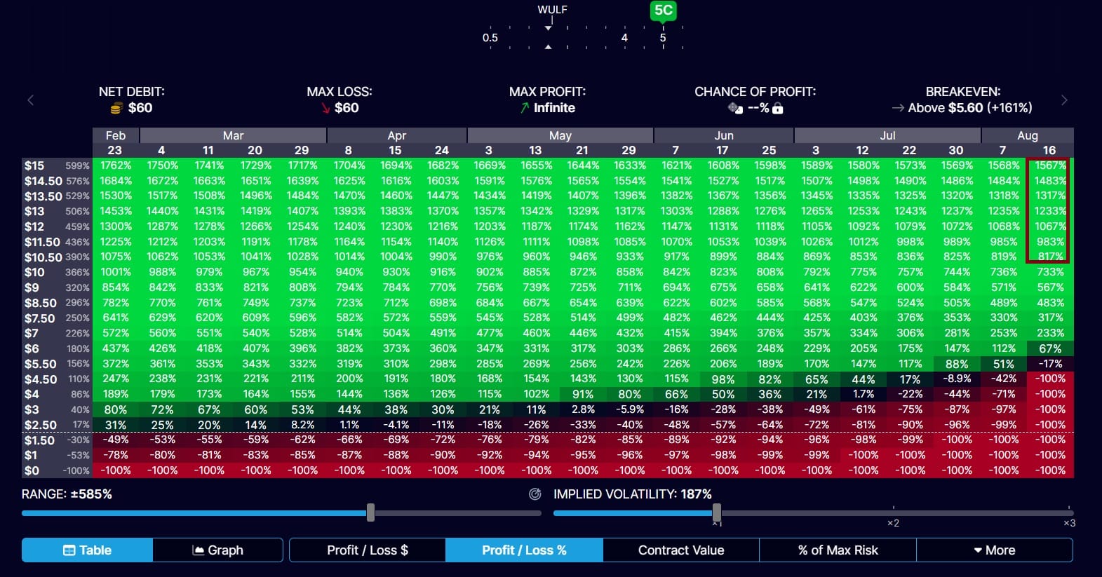 Persoonlijk bereken ik de optie niet dagelijks opnieuw, maar ik zet buy orders voor de optiecontracten die 10% en 20% onder de huidige prijs liggen. Voor Wulf zou ik bijvoorbeeld buy orders plaatsen op $0.50 en $0.45 per contract, wetende dat mijn rendement dan nog beter zal zijn dan ik momenteel heb berekend.
