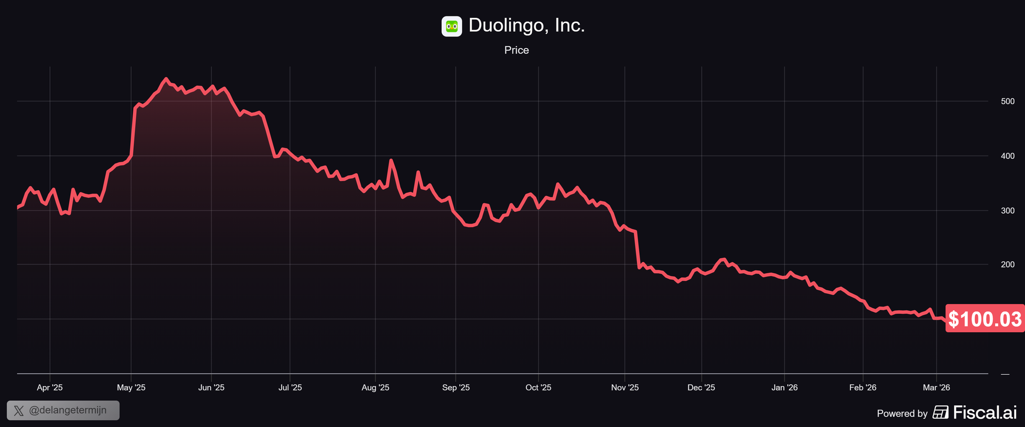 Dit aandeel wilde ik niet onbenoemd laten. Toegegeven, Duoling is geen typisch softwareaandeel, maar het heeft wel veel van die kwaliteiten: hoge marges, schaalbaar, en profiteren van AI-ontwikkelingen. Ook beweegt dit aandeel sterk mee op het sentiment van de software-categorie, dus ik wilde Duolingo graag uitlichten als bonus pick in dit artikel.