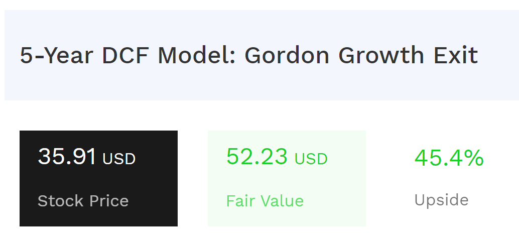 De hamvraag: wat is de fair value van Match Group en ligt er een aantrekkelijke upside voor beleggers? Volgens mijn rekenmodel, gebaseerd op een Discounted Cashflow Analyse met een verwachte omzetgroei van 8% CAGR in de komende vijf jaar en 36% EBITDA marges, is het aandeel redelijk gewaardeerd tussen de $50 en $55. Dit impliceert een potentiële upside van 45,4%.