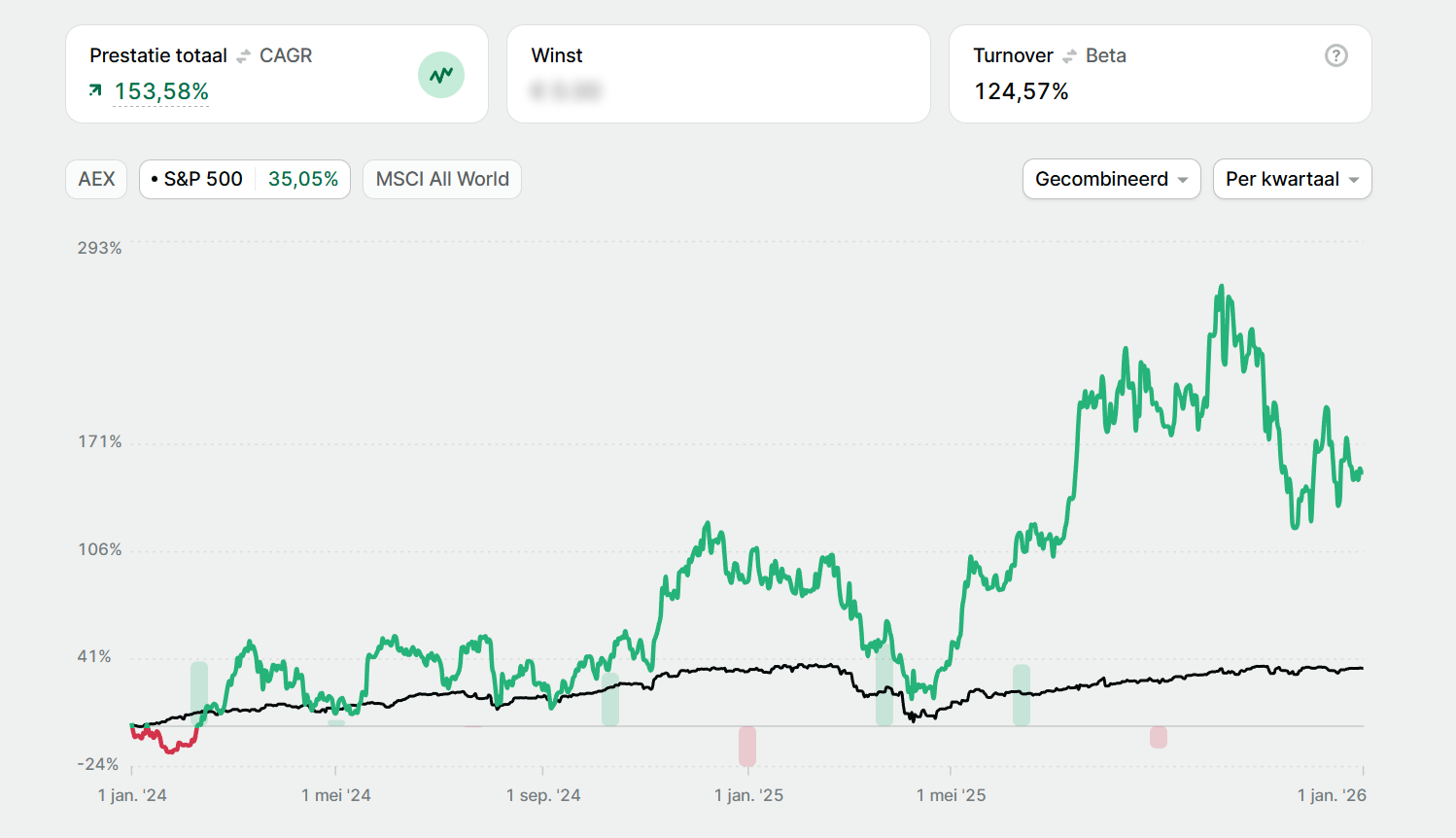 Sinds januari 2024 is het portfolio met 154% gestegen. Dat voelt als een mooie revanche na jaren met tegenvallende resultaten door geflopte beleggingen. Maar het is zeker geen reden om nu gas terug te nemen.