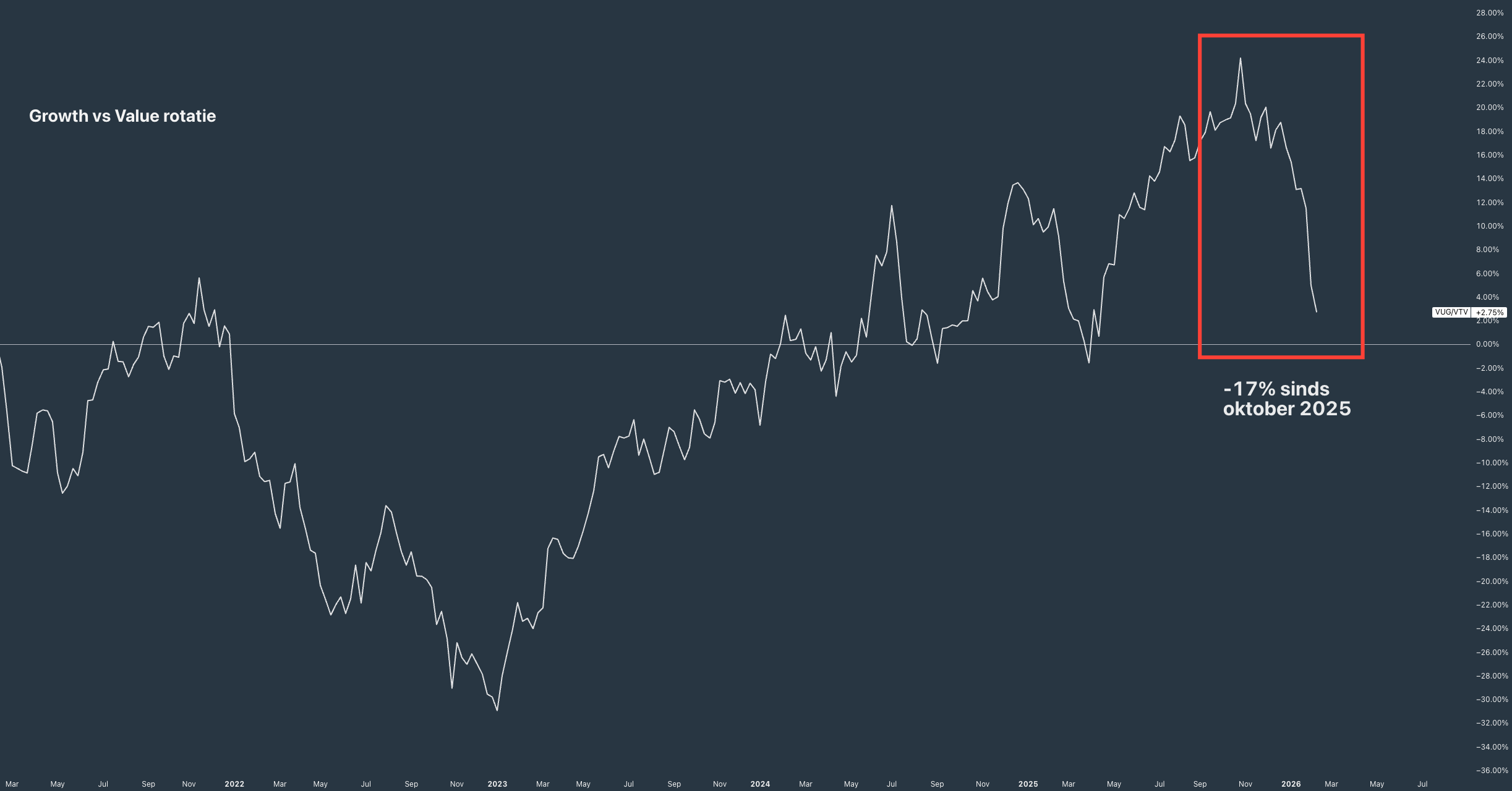 - VUG/VTV stijgend = groei wint van waarde - de markt betaalt graag voor toekomstverhalen, AI, hoge multiples.