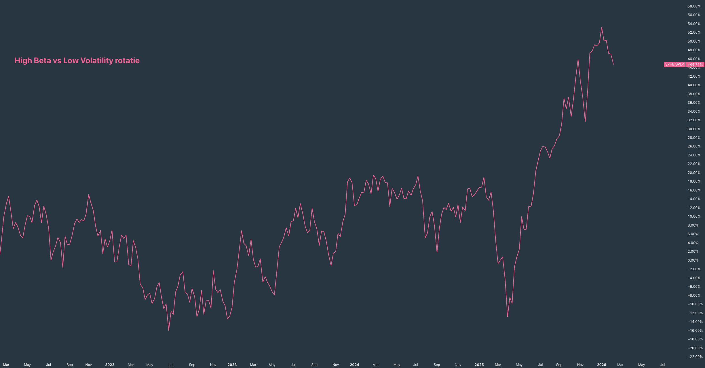 Ondanks dat de spread licht is gedaald sinds begin januari 2026, valt vooral op dat er sinds april 2025 een stijgende lijn te zien is. Beleggers roteerden dus niet weg van "high beta", maar bleven risico opzoeken.